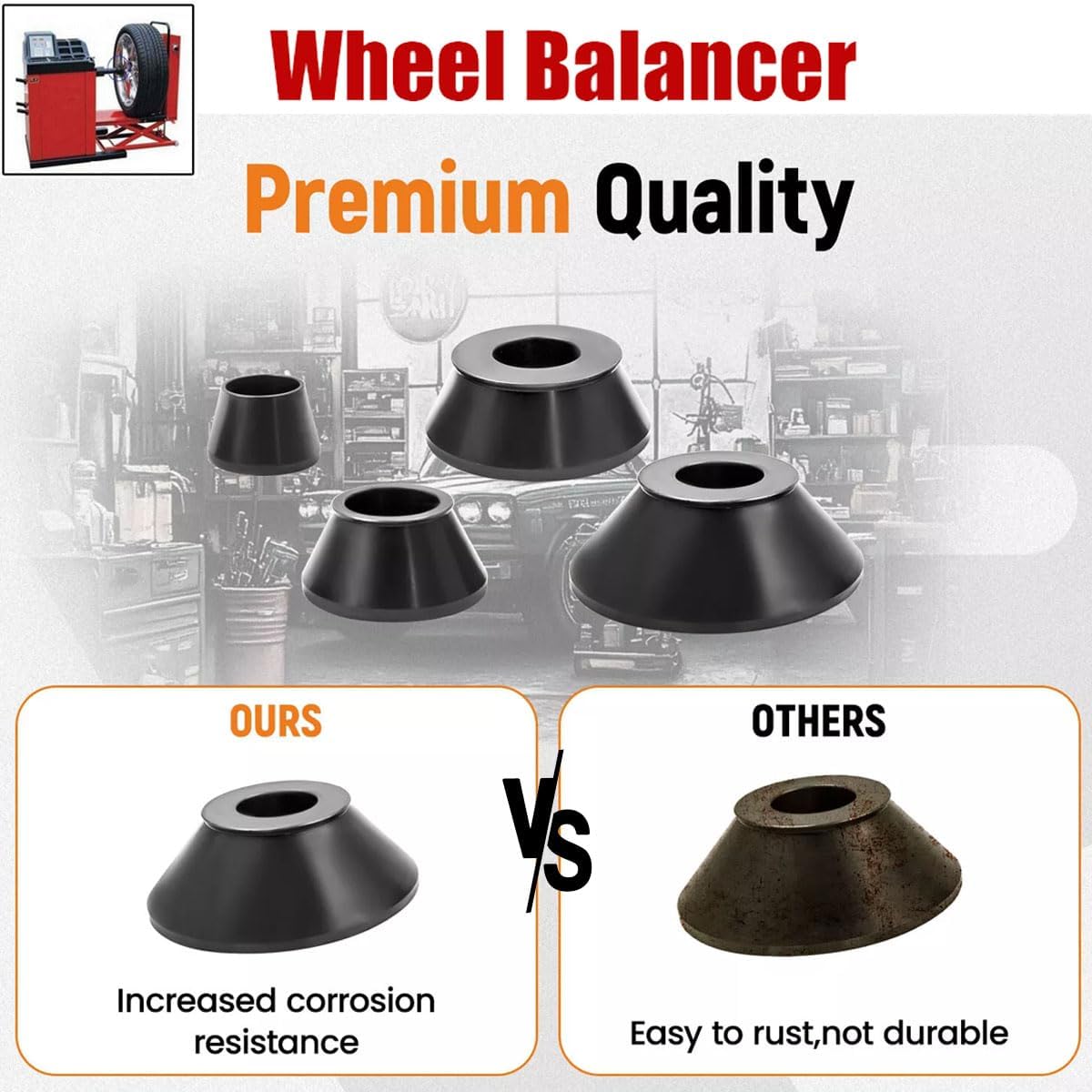 Made of premium quality #45 carbon steel, high rigidity and durable in use. Standard specification, fit for any wheel balancer which with 40mm shaft. Cone Sizes: 1.77" to 2.44", 2.05" to 3.15", 2.71" to 4.11", 3.66" to 5.39". Fits car, truck, caravan, and SUV that wheels with hub bores from 1.77" to 5.39". Work with aluminum, steel or alloy wheels.