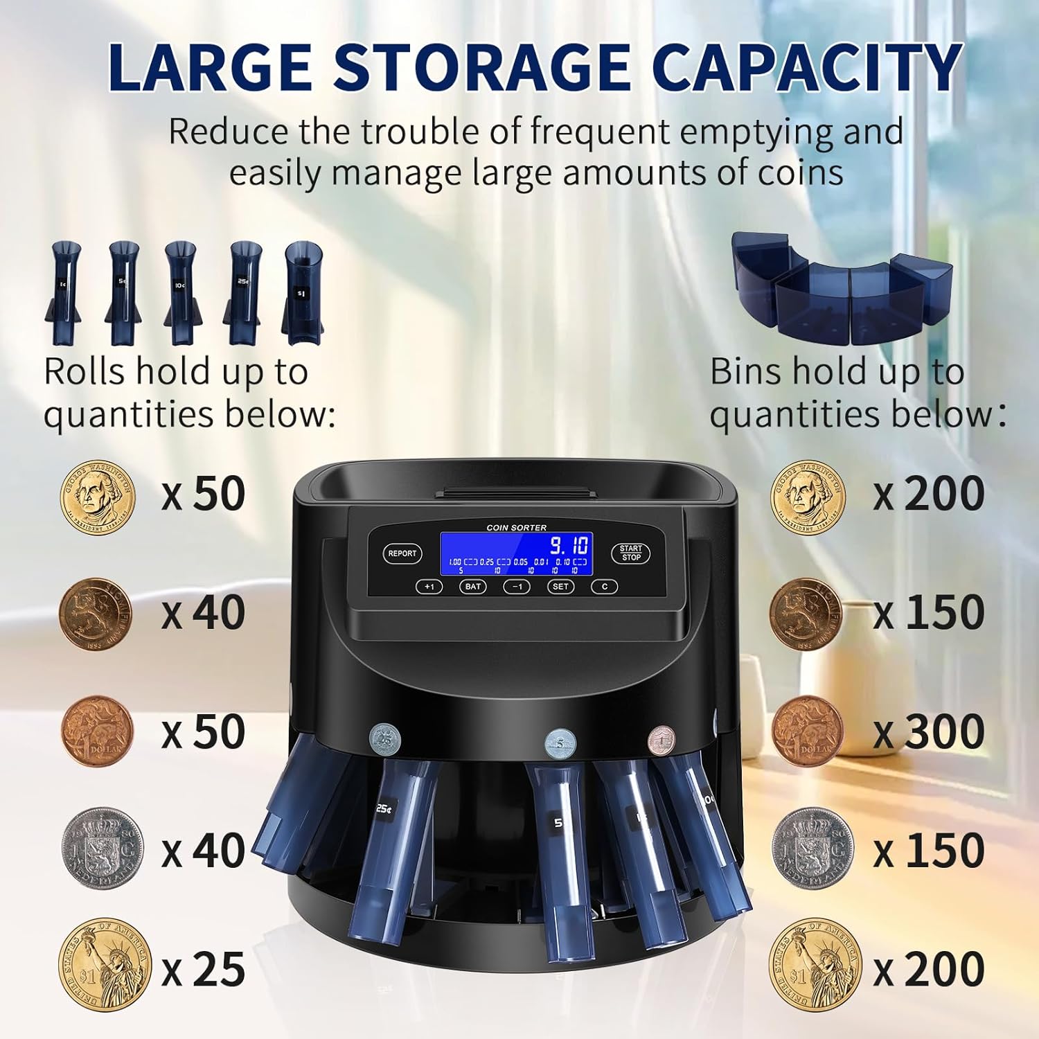 EFFICIENT AND FAST: The coin counter adopts the latest upgraded coin sorting technology, which can process up to 270 coins per minute, which is 10% more efficient than traditional models. The coin sorter and wrapper machine is equipped with a large-capacity coin hopper that can hold up to 300 coins, reducing the trouble of frequent emptying, ensuring long-term efficient operation, allowing you to save time and effort and easily manage large quantities of coins.