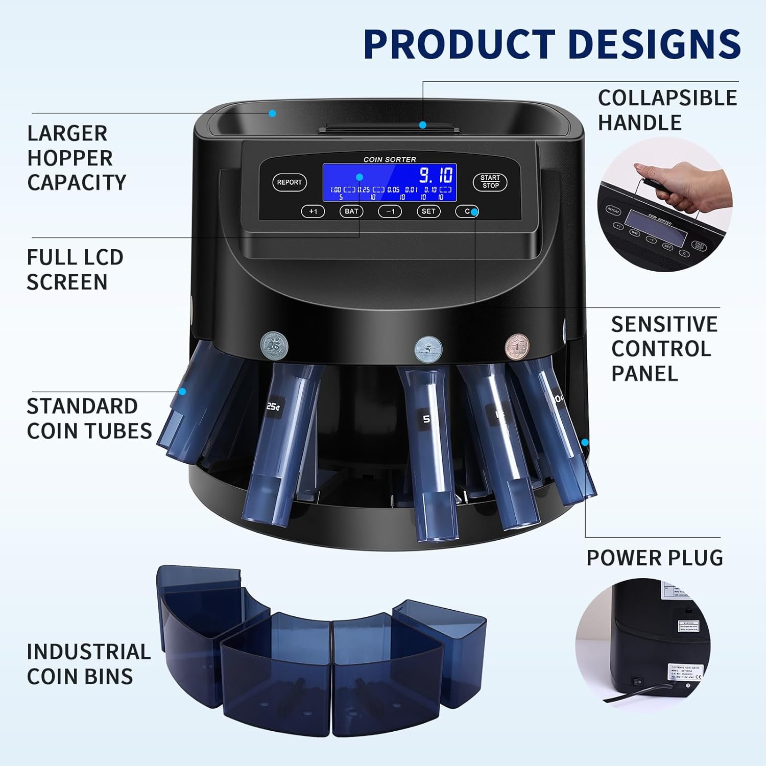 MULTI-PURPOSE: The coin sorter contains a coin tube attachment that can automatically fill pre-made coin wrappers. When the roll is full, the machine will automatically stop, providing great convenience for bank deposits or change exchange. The change counter is equipped with an intelligent anti-stuck coin system that can automatically detect and adjust the coin path, effectively reducing the risk of coin jams and ensuring smooth operation, making your change management smoother.