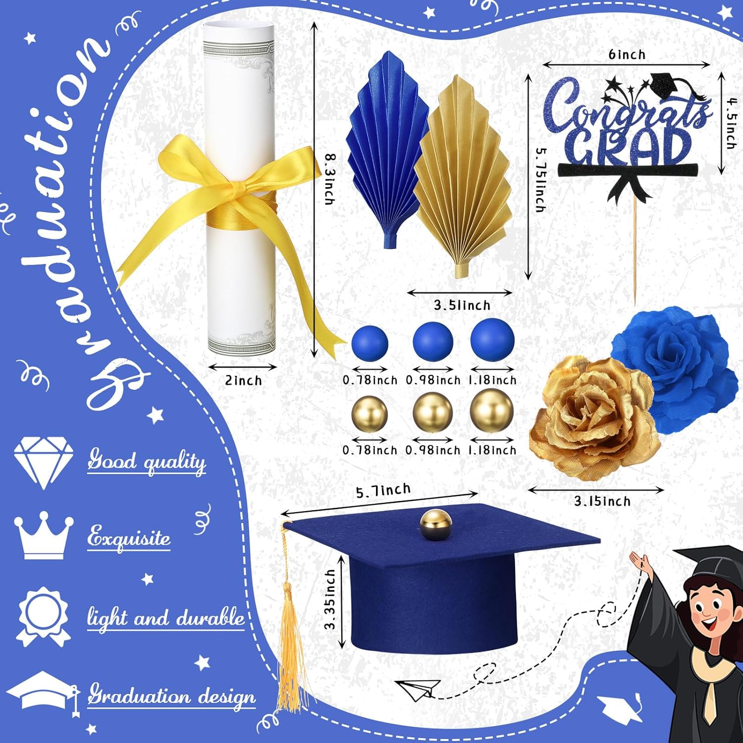 Quality Materials: each item in this kit is made of quality materials to ensure durability and aesthetic appeal; The grad cap topper is made of soft, thick felt while the diploma and congrats grad cupcake topper are crafted from sturdy paper; The beads leaf flower cake decorations are made from silk cloth, paper to provide a touch of sophistication