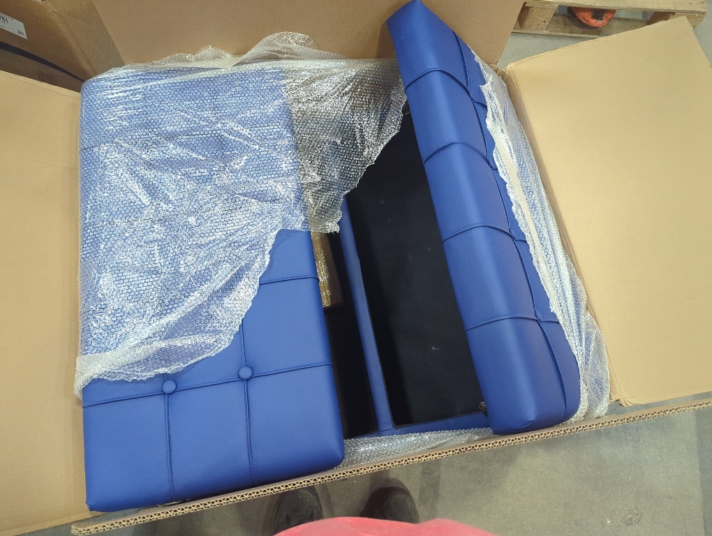 New Open box for inspection Color Blue Aesthetic and stylish Decor: The square leather ottoman is made of high-density foam and faux leather fabric material, the top tufted button decoration, and the bottom metal rivets locking edge craftsmanship, showing the elegant mid-century style