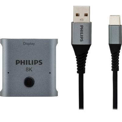 Color silver Simplify your entertainment setup with the Philips Elite 8K 2-Port HDMI 2.1 Switch. When you’ve maxed out your TV’s ability to connect to your favorite high-definition devices, this 8K and 4K HDMI switch turns one TV HDMI port into two. Easily change from one source to the other by pressing the button on the HDMI switcher. LED indicator lights clearly indicate which connected device is selected for use. Enjoy the ease of toggling between devices without the hassle of changing cables. This compact HDMI switch in a premium aluminum housing works with all brands of HDMI cables and devices like TVs, Blu-ray/DVD and streaming media players, gaming consoles and more. Additional HDMI cables, sold separately, are required to connect each source device to the HDMI switcher. A 6-foot USB cable is included to connect the switch to a USB-equipped wall outlet or your TV’s USB port for power, if needed. Designed for immersive HDTV, this AV switch is HDCP 2.2 compatible and supports high-resolution video up to 8K at 60 Hz and 4K at 120 Hz, Dolby Atmos, HD Dolby 7.1 surround sound and more. Take charge of your entertainment with the Philips Elite 8K 2-Port HDMI 2.1 Switch. SWV9173GR/37