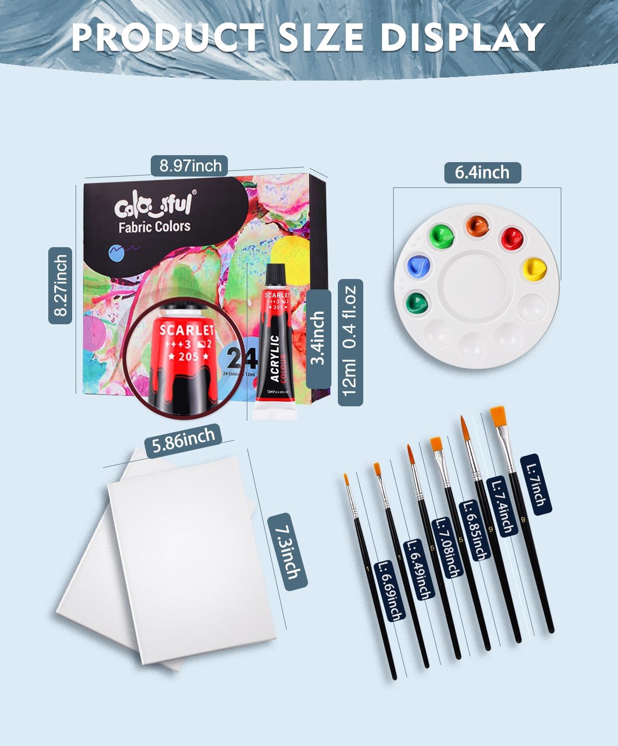 【Convenient All-in-One Package】The Colorful fabric paint supplies kit includes 24 tubes (0.4oz) of common colors, The kit also comes with 6 brushes and 1 palette, all neatly packaged in an exquisite colored box with the COLORFUL brand. This all-in-one package is not only convenient for beginners but also a great gift choice for kids or DIY hobbyists.