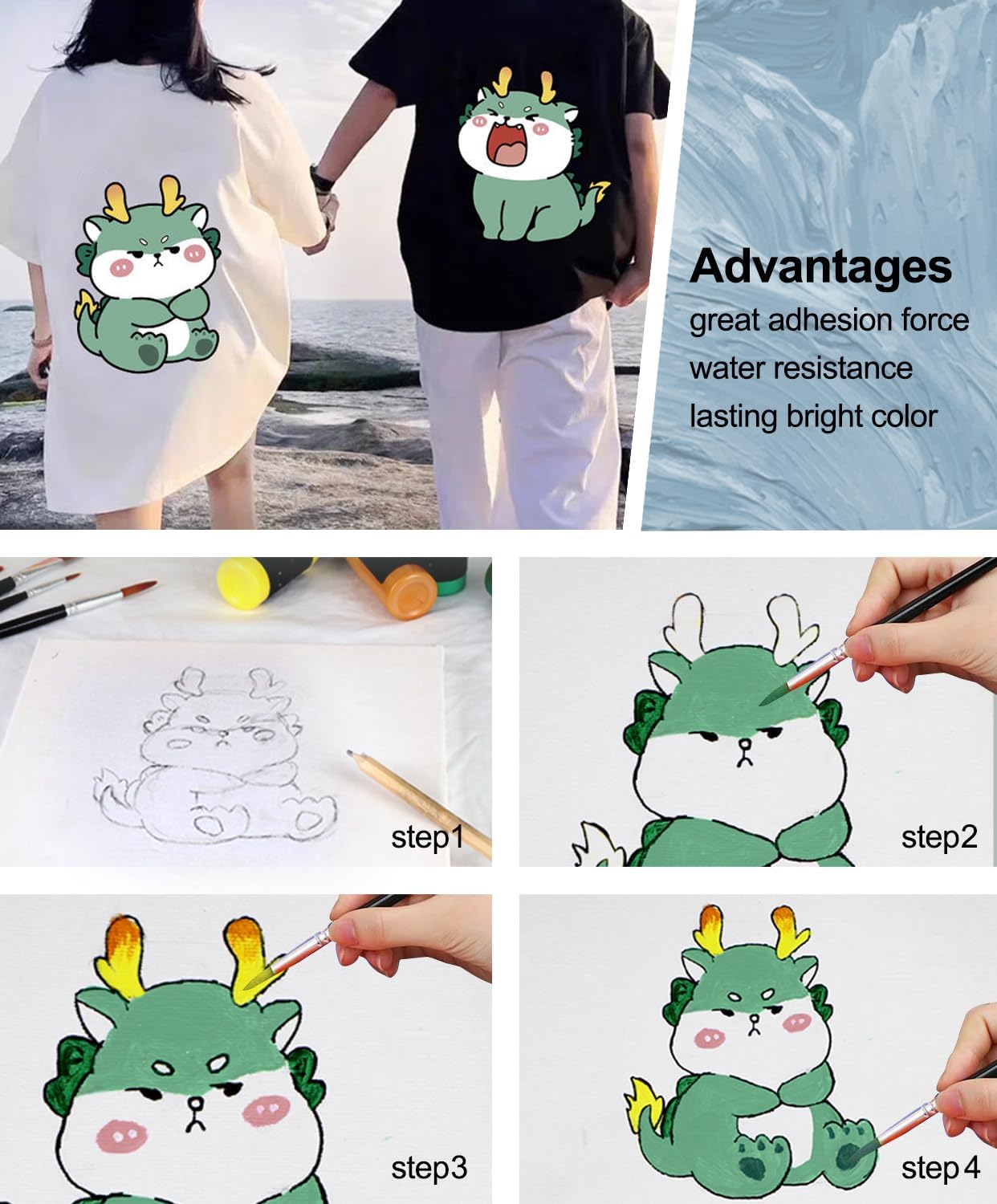 【No Heating Needed & Machine Washable Fabric Paint】 Our permanent fabric paints for clothing can be cured at ambient conditions with no heating required, thanks to its special formulation. The slick paint dries quickly and becomes waterproof once dry, making it machine washable. This makes our fabric paint set perfect for turning your decorated clothes into permanent craft art pieces and sweet memories.