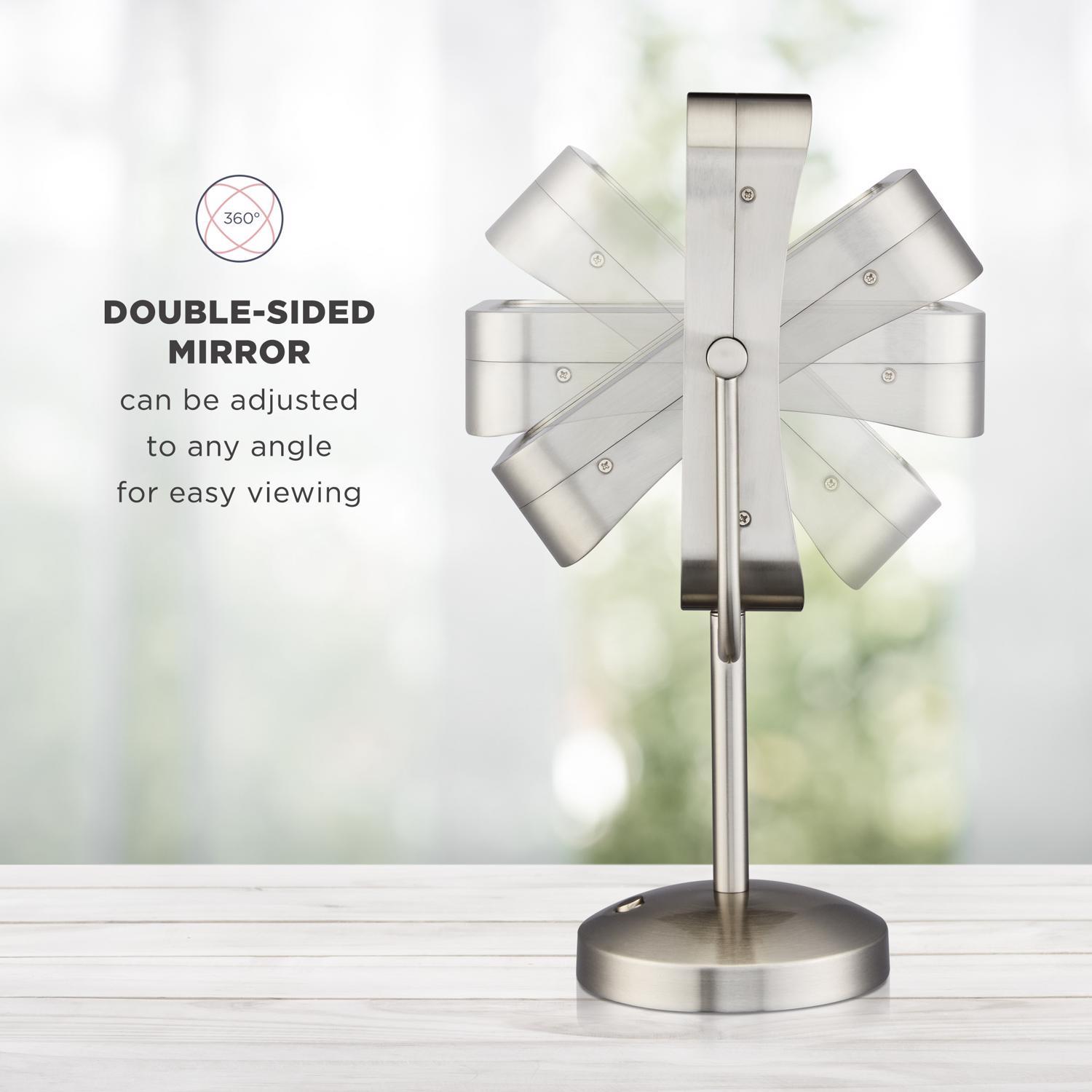 Manage your magnification with the Conair Reflections mirror that features an easy-to-position double-sided frame with a flip. The 8-inch oblong mirror goes from 1x magnification to 8x magnification and can be rotated 360 degree for a custom view at any angle. Mounted on a swivel display with a no-slip, no-tip weighted base, the mirror is illuminated with lifetime LED bulbs that never need to be replaced. Choose from 3 light settings (low, medium, and high) to customize the light depending on your location, time of day, and beauty needs. The brushed nickel finish gives this must-have mirror a sleek, modern look that complements any vanity. Use 1x magnification for a full-face view when applying makeup or doing everyday beauty checks. Switch to 8x magnification for close-up work like tweezing or detailed makeup application. This cord-free mirror runs on 3 AA batteries (not included) and provides natural lighting modes and intensity-level settings that make it easy to create the perfect hair and makeup for any occasion. Experience energy-efficient, adjustable LED lighting for flawless, fuss-free makeup application and grooming with the versatile and stylishly designed mirror that combines innovation and precision.