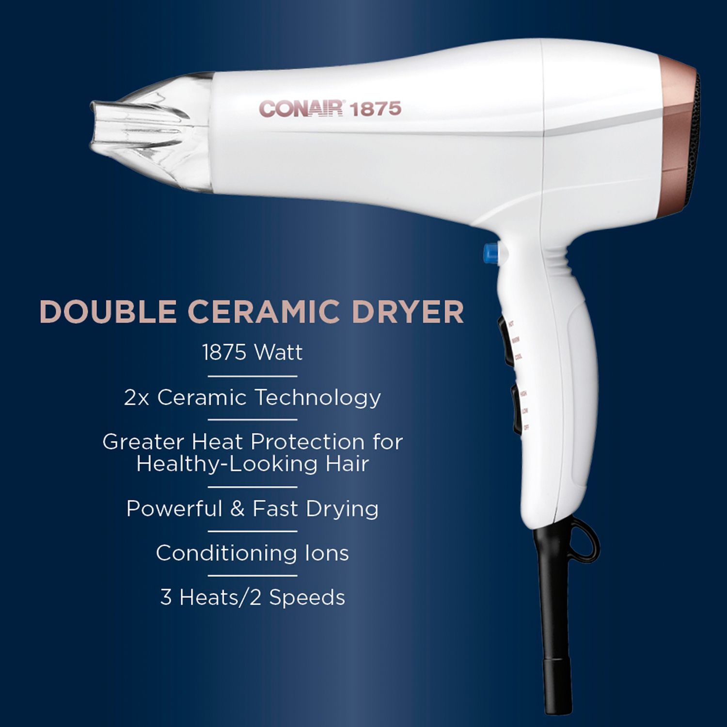 Style your hair with ease with this Conair double ceramic blow dryer.