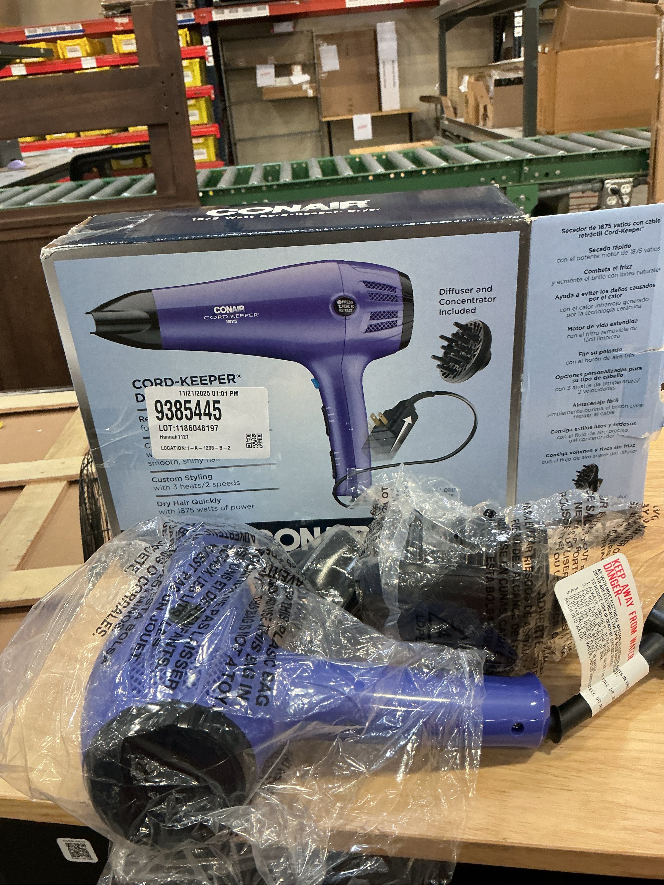 The Conair Cord-Keeper Hair Blow Dryer is equipped with all the features you need to create your favorite hair styles, plus a concentrator for pinpoint styling and diffuser to enhance natural curls and waves. For easy and convenient storage, just press the button to retract the cord line.