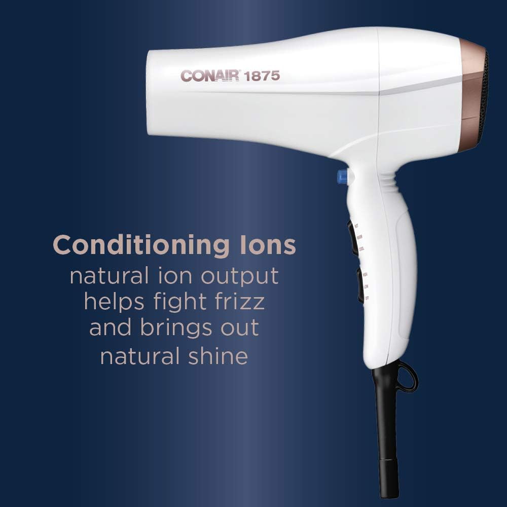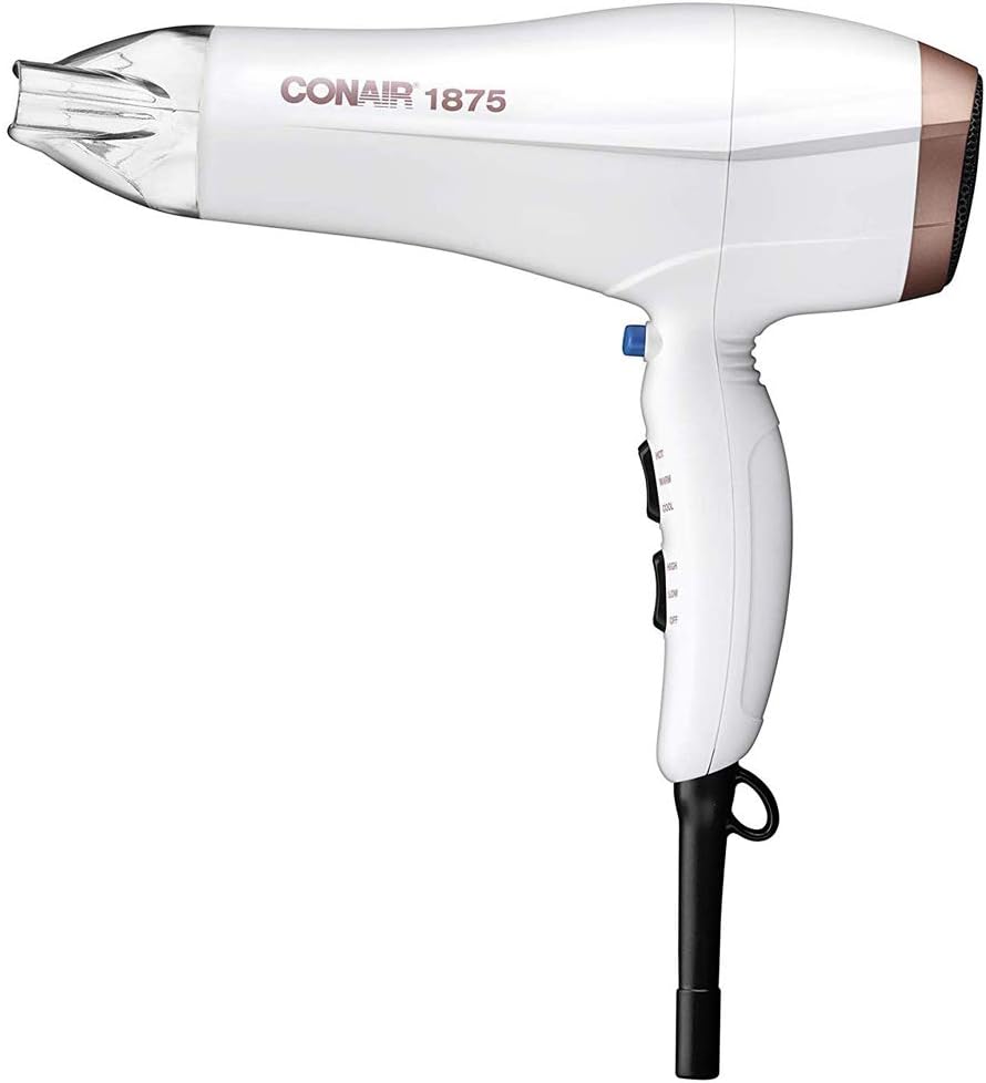3. Conair Double Ceramic 1875W Hair Dryer, 3 Heat/ 2 Speed Blow Dryer, Powerful and Fast Drying, Includes Concentrator, Cool Shot Button, Removable Filter, White, Travel hair dryer