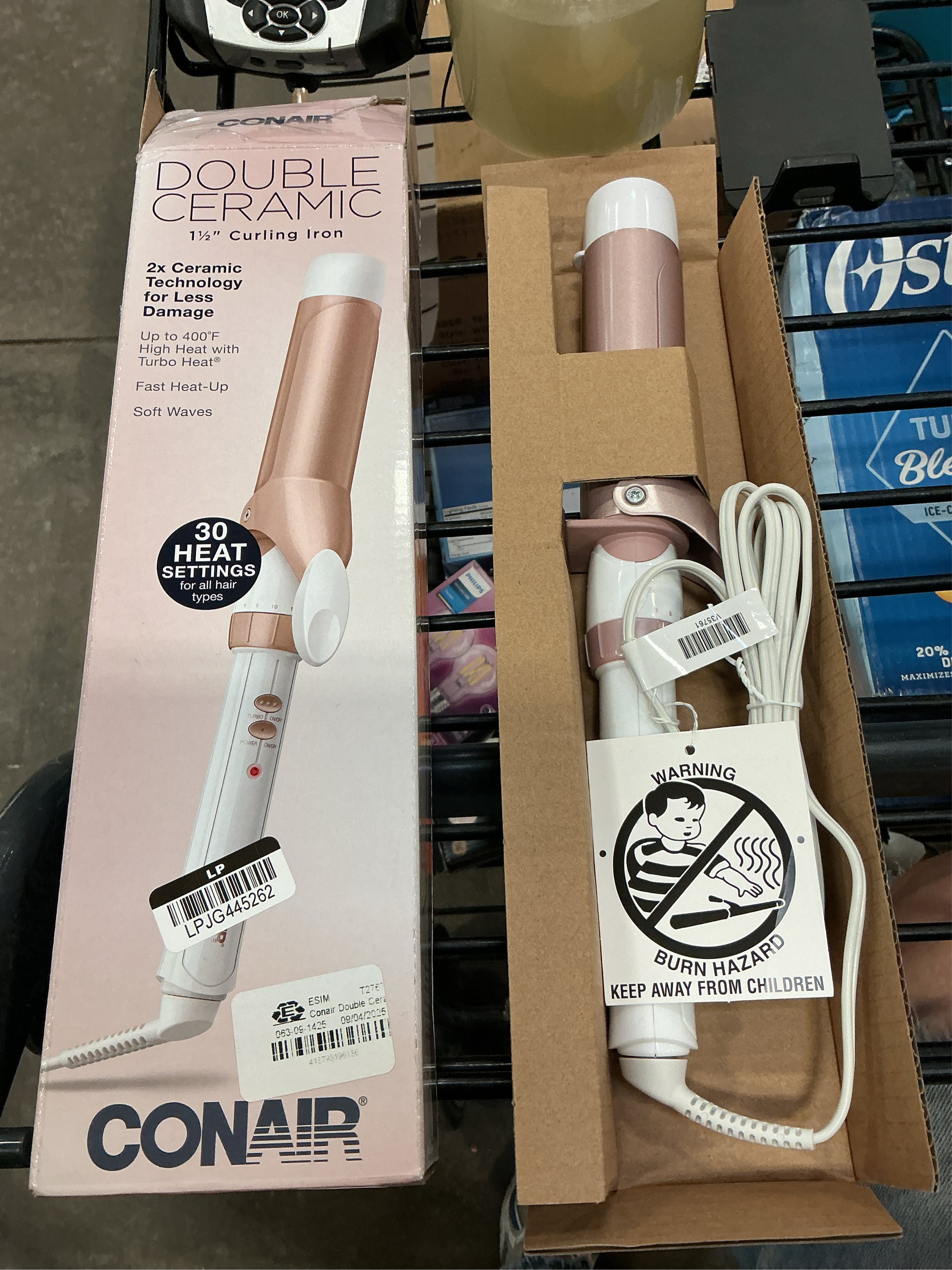 DOUBLE CERAMIC CURLING IRON: Style soft curls and waves or touch up natural texture with this Conair 1.5-inch curling iron designed with twice the ceramic for even heat, less frizz, and long-lasting curls.