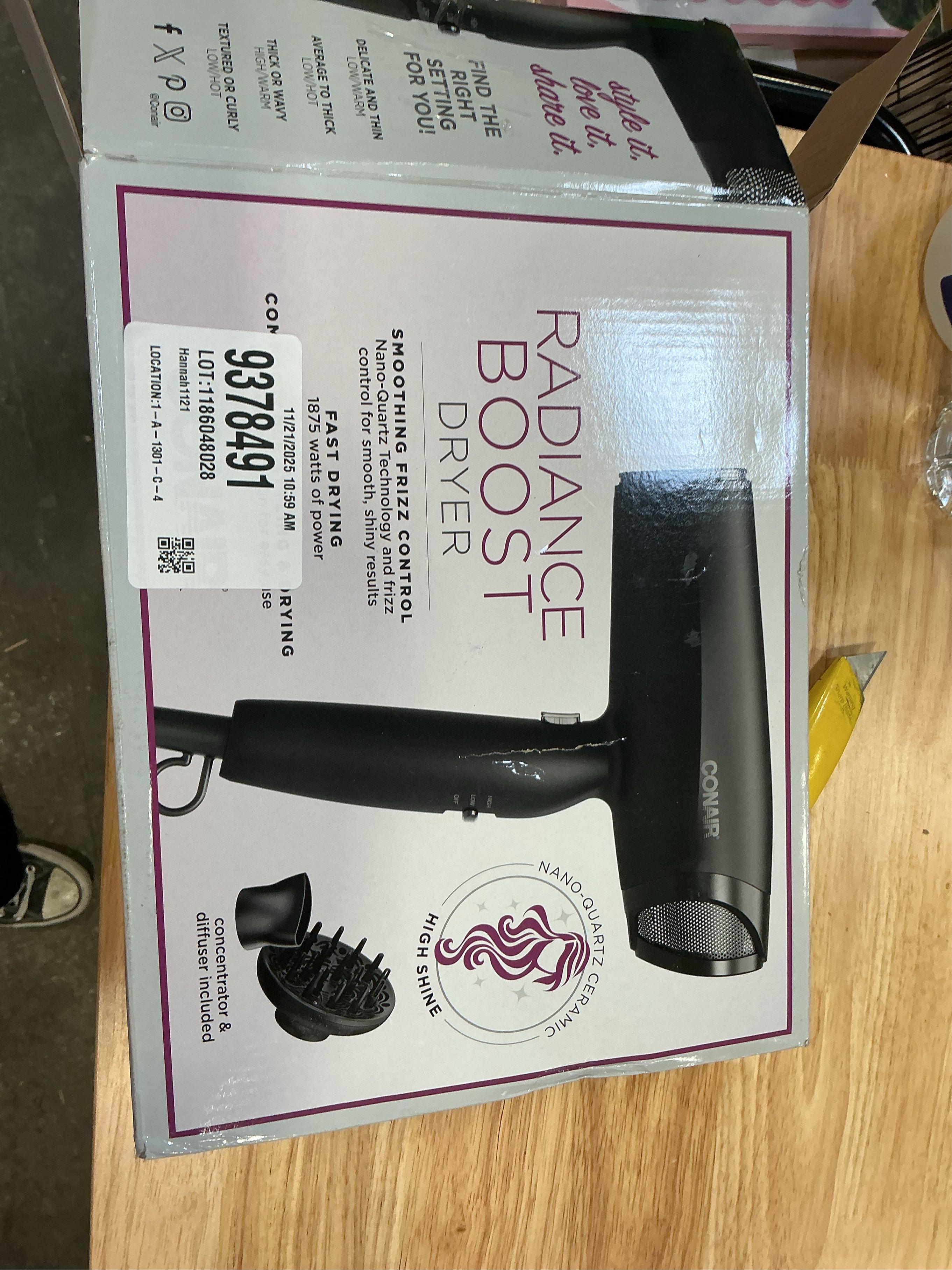 Achieve salon-quality results effortlessly with the Conair® Radiance Boost Dryer. Harnessing nano-quartz technology, this advanced hair dryer smooths frizz, enhances shine, and leaves hair irresistibly silky. The powerful motor dries hair fast while ceramic heat minimizes heat damage as you style. Tailor your experience with 3 heat and 2 speed settings, along with a concentrator for sleek finishes and a diffuser for enhancing natural waves. The cool shot button locks in your look while the lightweight, ergonomic design ensures comfort and control. Transform your daily routine into a luxurious styling experience. Whether you're aiming for a sleek, polished look or to enhance your natural curls, the dryer's precision-engineered features ensure optimal performance. The nano-quartz technology helps to reduce frizz and create style and shine that last. With the concentrator for precise styling and the diffuser for bringing out the natural texture of defined curls, you have the versatility to achieve any hairstyle with ease. Embrace effortless styling and drying with our lightweight, ergonomic design that offers comfort and control, ensuring every session leaves your hair smooth, radiant, and beautifully styled.