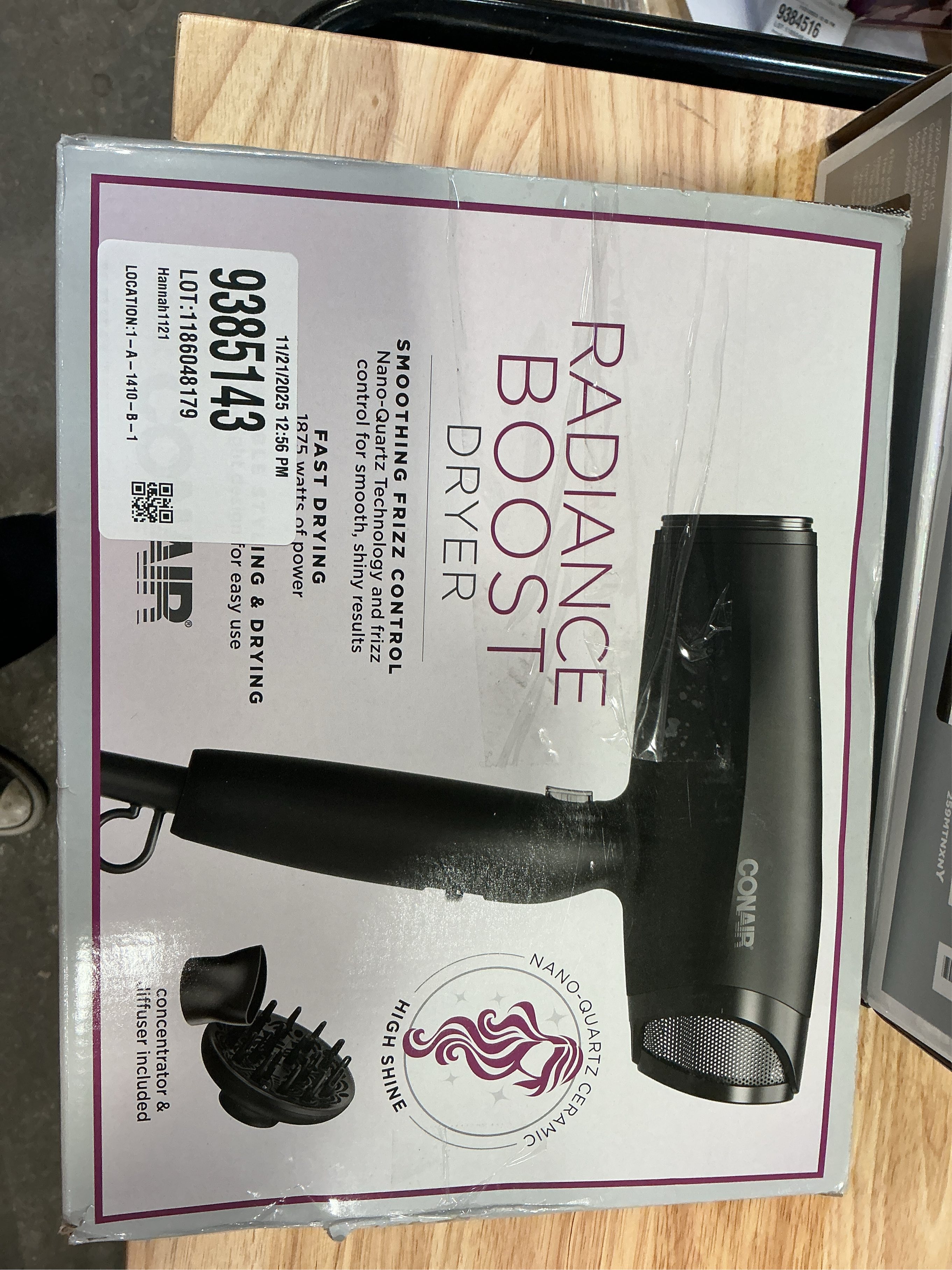 Achieve salon-quality results effortlessly with the Conair® Radiance Boost Dryer. Harnessing nano-quartz technology, this advanced hair dryer smooths frizz, enhances shine, and leaves hair irresistibly silky. The powerful motor dries hair fast while ceramic heat minimizes heat damage as you style. Tailor your experience with 3 heat and 2 speed settings, along with a concentrator for sleek finishes and a diffuser for enhancing natural waves. The cool shot button locks in your look while the lightweight, ergonomic design ensures comfort and control. Transform your daily routine into a luxurious styling experience. Whether you're aiming for a sleek, polished look or to enhance your natural curls, the dryer's precision-engineered features ensure optimal performance. The nano-quartz technology helps to reduce frizz and create style and shine that last. With the concentrator for precise styling and the diffuser for bringing out the natural texture of defined curls, you have the versatility to achieve any hairstyle with ease. Embrace effortless styling and drying with our lightweight, ergonomic design that offers comfort and control, ensuring every session leaves your hair smooth, radiant, and beautifully styled.