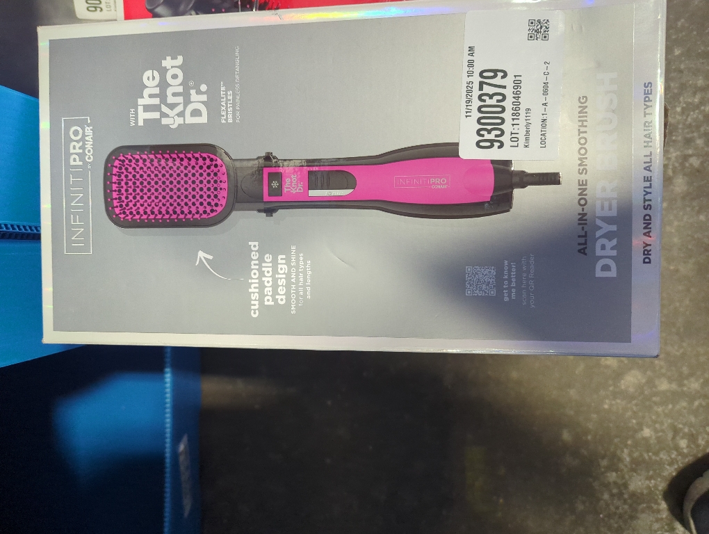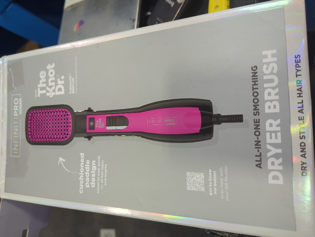 The all-in-one smoothing dryer brush from infinitipro by conair with the knot dr.® was created to perform the perfect knotectomy™—aka painless knot removal—every time you use it. While other styling brushes may pull, tug, and even tear large clumps of hair, this innovative brush renders the removal of knots painless. In fact, the epoxy tips of the flexalite™ bristles gently massage the scalp as they detangle for a soothing effect. Meanwhile, ionic technology eliminates frizz, flyaways, and static while adding high shine. To boost volume, brush close to the roots with the bristles pointing upward and pull the hair taut against the silicone paddle so the bristles penetrate through the hair. For maximum volume, brush with your head upside down.# of Heat Settings: 3Features: Temperature ControlConcerns: VolumizingVoltage (volts): 120vWattage (watts): 1000wCord Length (ft.): 6 FtBase Material: 100% PlasticCare: Wipe CleanCountry of Origin: Imported