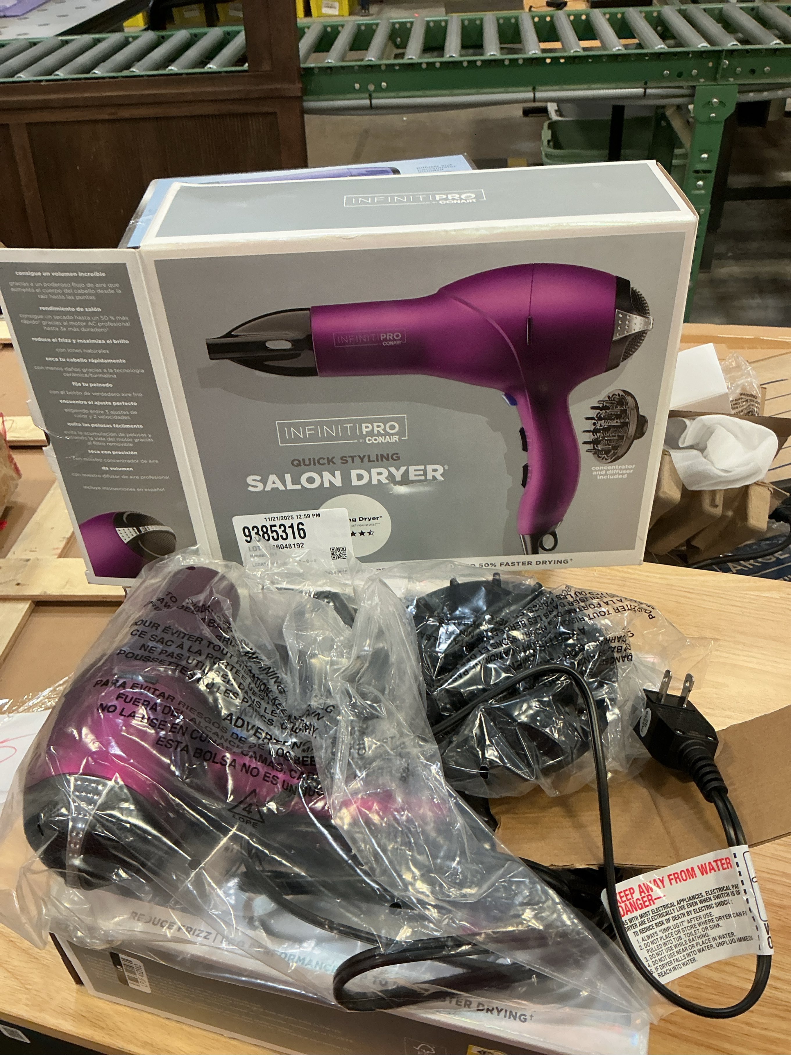 Less frizz. Pro performance. Up to 50% faster drying.* Get it all with the Quick Styling Salon Dryer from InfinitiPRO by Conair.® As the #1 selling dryer** with thousands of consumer reviews,† this styling essential is your go-to for salon results at home. Get incredible volume with powerful airflow from roots to tips with a professional AC motor that lasts up to 3x longer.* Want smooth, shiny hair? Ionic technology gets it done, with up to 75% less frizz.‡ You'll dry faster with less damage because ceramic technology protects your hair with gentle infrared heat. Choose from 3 heat and 2 speed settings to get your look just right with the perfect speed and heat for your hair type. To dry with precision, attach the sleek concentrator. Prefer more lift as you style? Attach the professional diffuser. The handle is designed to fit comfortably in your hand and make styling extra easy and comfortable. Once you've got your ideal look, lock it in with the true cold shot. Salon performance made easy! The Quick Styling Salon Dryer spares you the trip to the salon with professional technology that's simple to use. Fast drying for root-to-tip volumizing is a major time-saver. And the combination of Ceramic Technology and Ionic Technology reduces heat damage, frizz, and flyaways. You get beautiful, frizz-free body for a silky, shiny, healthy-looking finish. No wonder this is the #1 selling dryer** with thousands of reviews.† Be sure to use the diffuser for maximum volume or the concentrator to focus airflow for straight styles. The filter is removable, so you can remove the lint buildup and keep the dryer working like it should. Lose the lint to maximize performance and extend the life of the motor. Dry like a pro—quickly and easily—with this versatile and powerful styling essential from InfinitiPRO by Conair. *When compared to other Conair® DC motor hair dryer and styler models. **The enclosed hair dryer is the #1 selling dryer among pistol-grip hair dryers sold in the US, based on IRI Scan Data for dollar sales from 6/28/20. †The enclosed hair dryer has thousands of reviews based on consumer reviews as of 7/15/20 from leading e-commerce retailers. ‡When compared to hair dryers with natural ion generation.