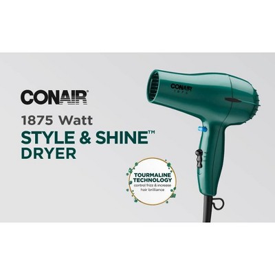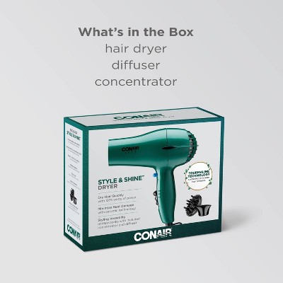 Dry quickly and boost shine while reducing damage with the Conair® Style & Shine Hair Dryer. This versatile styling essential minimizes frizz and maximizes shine with tourmaline technology. As you style, natural ion generation neutralizes frizz and flyaways, leaving hair healthy-looking and manageable. With 2 heat/speed settings, it's easy to customize styling to match your preference and hair type. The ergonomic handle fits perfectly in your hand for comfortable styling. Want to add more volume to your look? Attach the professional diffuser. For sleek styles, snap on the precision concentrator. To lock in your look, use the cool shot button. The Conair® Style & Shine Hair Dryer puts the power to explore endless styles, from voluminous waves to straight looks, in the palm of your hand. With 1875 watts of power, it gives you salon performance for professional results any stylist would envy. Infrared heat from tourmaline ceramic technology ensures a fast and easy drying process with less damage while conditioning ions produce frizz-free shine. Bring out the full beauty of your hair and take blow-dry styling to the next level with this salon-caliber hair dryer from Conair.