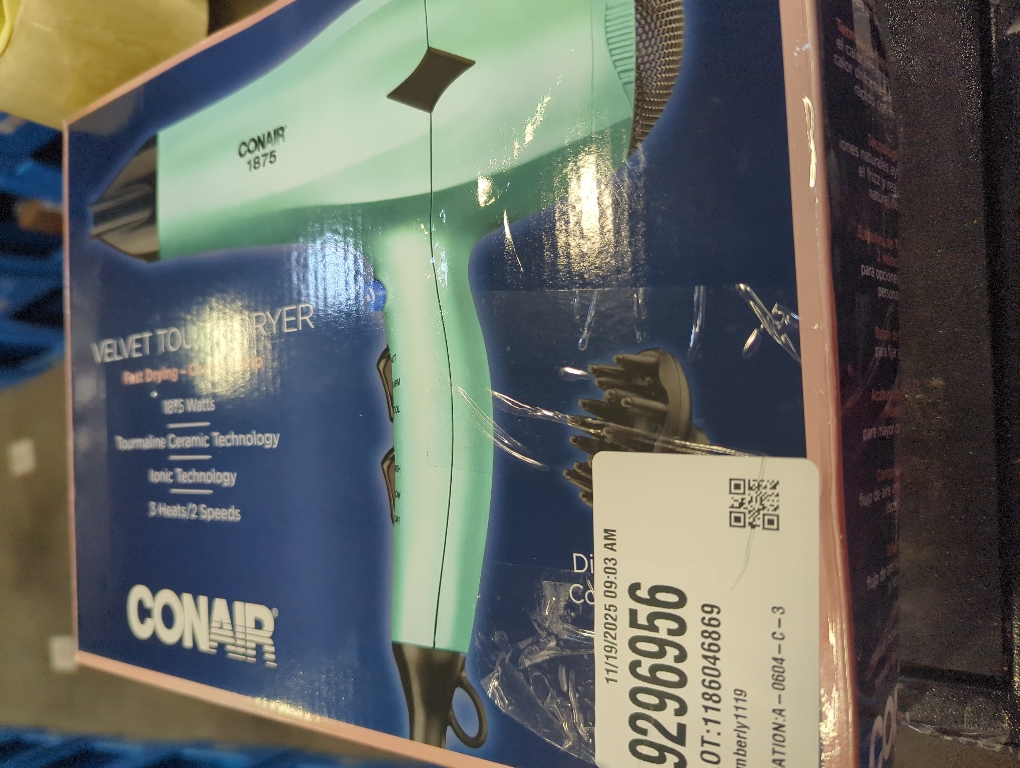 Why You’ll Love ItThe Conair 1875 Watt Velvet Touch Dryer is lightweight but powerful for fast drying. Tourmaline Ceramic technology provides infra-red heat to protect hair from damage, and Ionic Technology provides natural ion output that helps to fight frizz and enhance shine. Customize styling to match your hair type with 3 heat and 2 speed settings, then lock in your look with the cool shot. Product DetailsThis full-size blow dryer has a trendy matte Velvet Touch finish with no-slip grip ™ to make drying and styling easy and comfortable. Use the concentrator for smooth, sleek looks and the diffuser for curls and waves. 5' cord length gives you plenty of elbow room as you style.About Conair HaircareWhen it comes to keeping your look on trend, Conair has you covered. We’ve been doing beautiful things for hair for over 60 years, and we continue to bring you the latest trends and technology. Our full range of professional-quality hair dryers, flat irons, curling irons, curling wands, hair setters, and specialty stylers make it easy to create the looks you love. Bring out the full beauty of your hair with Conair!