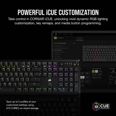 The CORSAIR K70 CORE gaming keyboard empowers your best play and makes gaming and typing amazing. With silky-smooth CORSAIR Red linear mechanical switches and two layers of sound dampening foam for a superior typing sound and feel, this is premier CORSAIR performance at its core. Take control effortlessly with a multi-function rotary dial and programmable media button, configurable in iCUE. Use iCUE to also customize the K70 CORE’s dazzling per-key RGB lighting and make your desktop your own dynamic work of art, and then save your RGB settings and macros on up to five onboard profiles to always have at the ready. Your ambition starts with the K70 CORE.