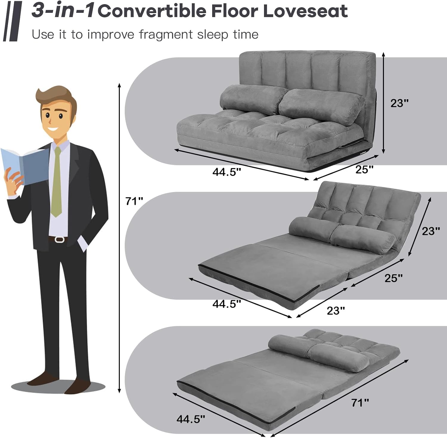 [3-in-1 Convertible Floor Loveseat] You can use this floor sofa in 3 ways---set upright as a couch seat, lay flat as a sleeper, or recline at a certain angle as a lounge to improve fragment sleep time. It is a perfect fit for small living areas, like condos, apartments, dorms, where a full-size sofa is not an option.