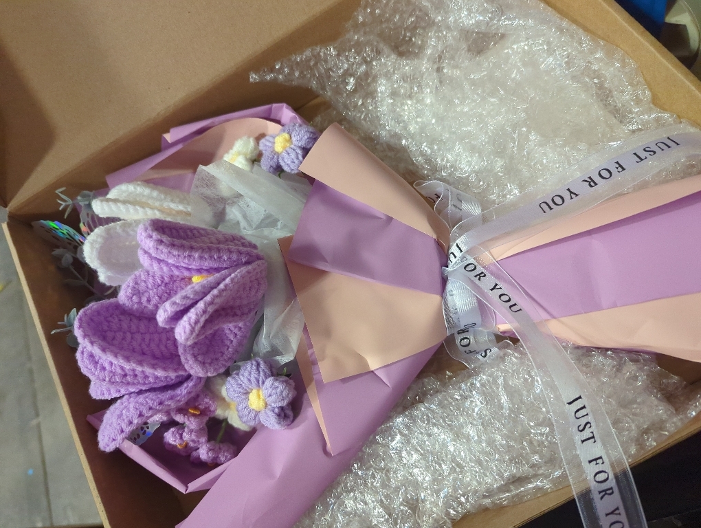 Complered Crochet Flower Bouquet: This woven bouquet includes three tulips of different colors, four cream puffs, five forget-me-nots and three artificial eucalyptus trees, looking exquisite and elegant. Crafted by professional artisans with meticulous weaving, it offers a natural skin-friendly feel and long-lasting durability.