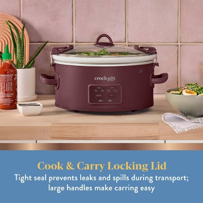 With its streamlined silhouette and dramatic Lambrusco color, this Crock-Pot® Design Series programmable slow cooker combines modern functionality and sensibility to easily complement your lifestyle and design aesthetic. Cook meals on your schedule, and take them with you on-the-go with the travel-proof locking lid that seals tightly to prevent leaks and spills during transport to your favorite outings, parties, and tailgates. Its sturdy handles make lifting and carrying it a breeze, at home or on-the-go. Four pre-programmed settings allow you to select the perfect slow cooking time and temperature and the Auto-Warm setting keeps food at the ideal temperature until it's time to eat. The stoneware bowl is also oven safe up to 400 degrees F, giving you the option to crisp foods prior to serving. The large 6-quart capacity cooks meals for 7 people, perfect for family meals or feeding a crowd. Cleaning this Crock-Pot® slow cooker is easy: the stoneware and the glass lid are dishwasher-safe. For busy people who want nutritious home-cooked meals, this slow cooker makes mealtime easier—and looks great on your countertop, too!