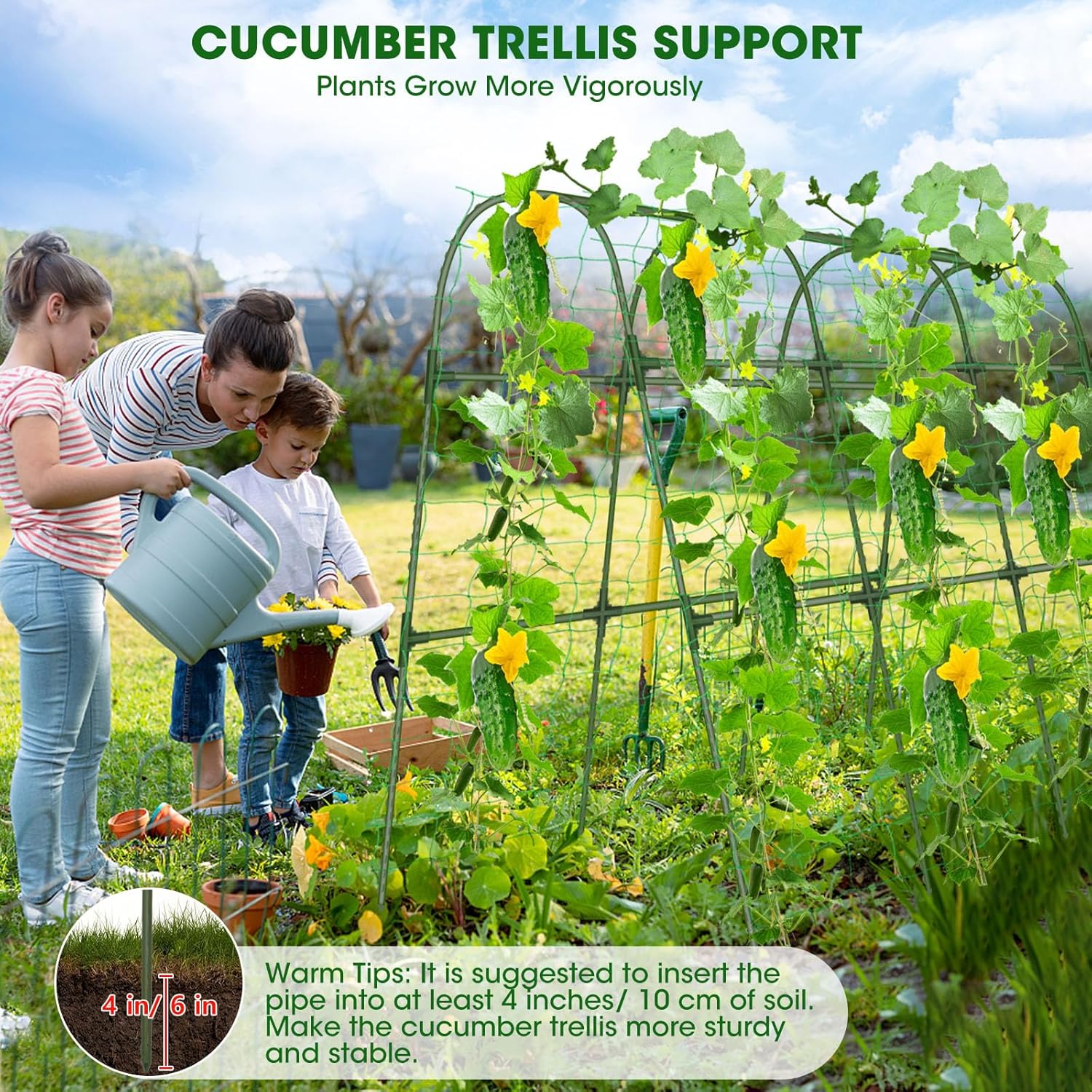 【Package Detail】Super High Cucumber Trellis X1(47.2x47.2"X21.6"),Garden clips X20,Leaf Ties X100,Twist Tie X1,Trellis NettingX1,Manual X1.