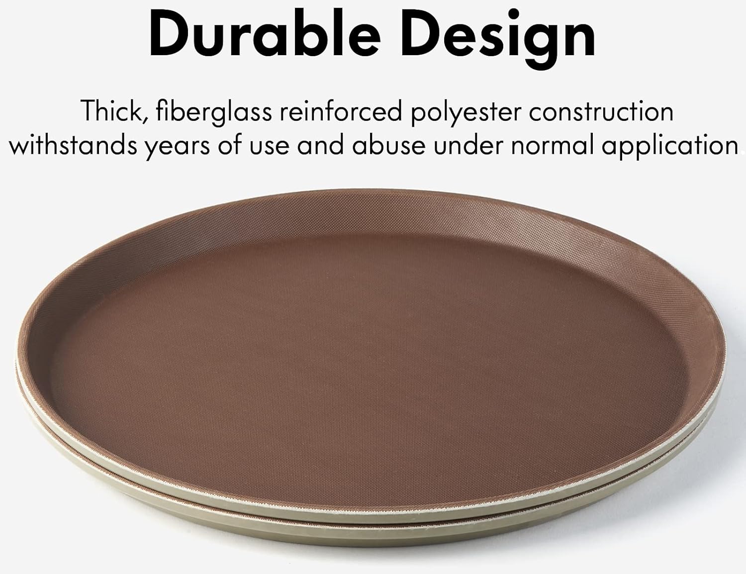 Set of two 14-inch restaurant-grade round serving trays - Perfect for a variety of businesses from bars to banquet services, CURTA serving tray ensures that orders don't slide off or spill during transport or service. Its elegant design and classic brown color make it great for enhancing your dishes and beverages presentation. Non-skid liner - This tray has raised edges and a non-skid surface that keeps dishes or glassware firmly in place. This feature also prevents items from sliding off the tray, which helps prevent spills and messes. CURTA serving trays are definitely a must for busy food establishments! Durable design - Made with durable fiberglass, the tray is designed to easily handle heavy weight loads, as well as withstand the wear and tear of everyday use. NSF-Listed - NSF-marked items mean the products meet strict public health protection standards. It can help you maintain a high level of food safety in your establishment and protect customers. NSF International reviews material choices, manufacturing processes, manufacturing facilities, and the final product to confirm that all phases of production meet their standards. Easy to clean and dishwasher-safe - CURTA non-skid trays are dishwasher safe, but occasionally need to be washed by hand with warm water and soap to prevent build-up. The stacking lugs also promote air circulation for fast drying.