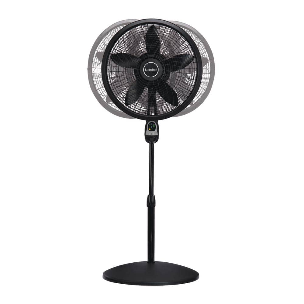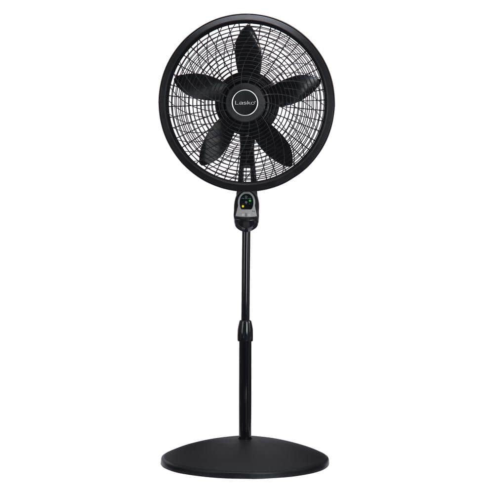 The ideal fan for living rooms, bedrooms & more. With 3 quiet speeds and widespread oscillation, this fan will help you feel cooler and more comfortable throughout the year. Great looking and capable of cooling the largest home spaces, this black pedestal fan from Lasko features a tilt-back fan head for directional airflow control and fully-adjustable height up to 54". The included remote is easy to use and allows you to control the power, fan speed, and timer functions. Simple 'no tool' assembly. Simple electronic controls with 3 refreshing speeds. 4-hour auto-off timer. Multi-function remote control with on-board storage. Widespread oscillation for full room coverage. Fully adjustable height (up to 54") and tilt-back fan head to customize airflow. Simple "no-tool" assembly. Includes a trusted, fused safety plug. Features a 6-foot power cord. ETL listed for safety. Fan diameter (in.): 18 in. Fan Diameter (in.): 16-20. Fan Features: Oscillating. Fan Features: Remote Control. Fan Features: Adjustable Height. Power Type: Plug-In. Number of Fan Speeds: 3 Speeds. Number of Fan Speeds: 1-3 Speeds.