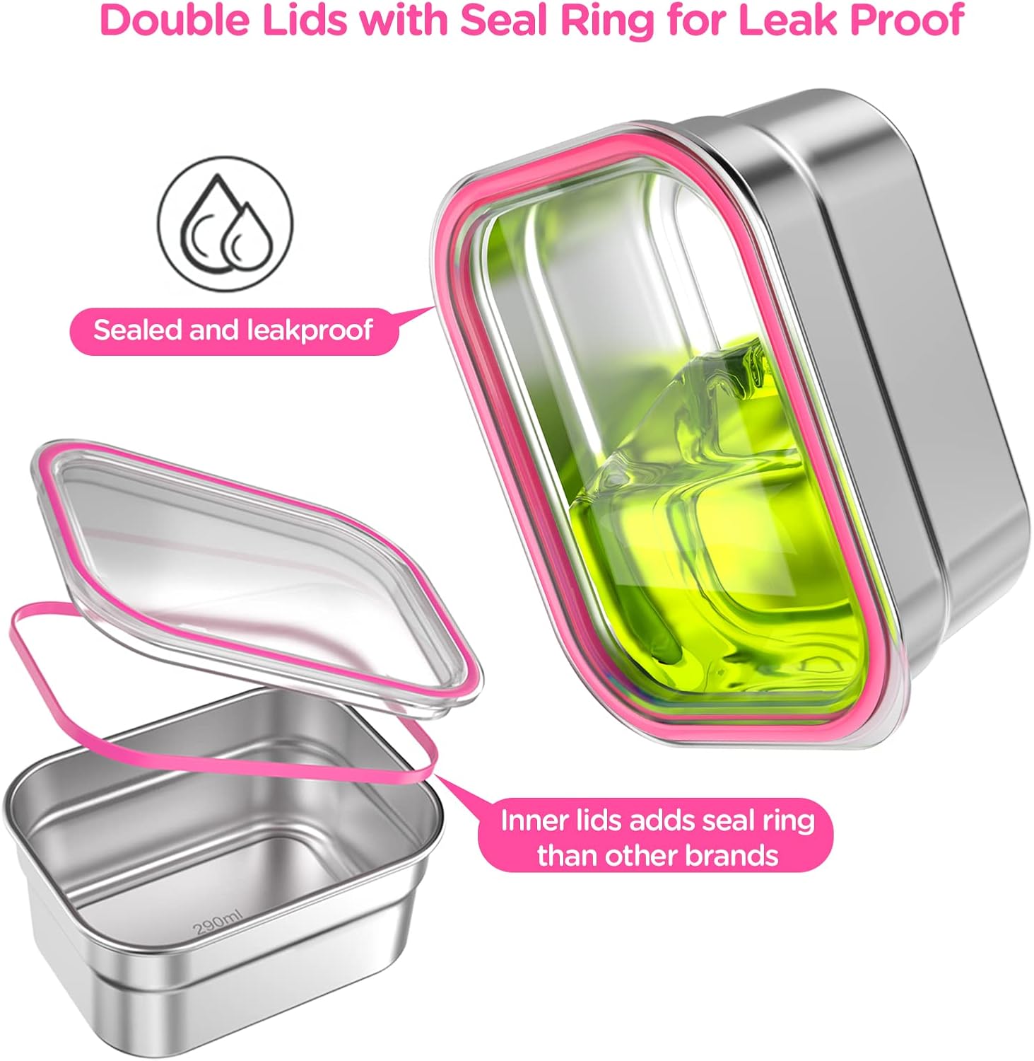 Double Lids with Seal Ring for Leak Proof -- The 4 inner small lids add seal ring than other brands to make sure 99.99% leak proof, and the outer larger lid with 4 clips on each side, the 4 little feet under the bottom can keep the bento box stable, all the special design will help keep this bento box well seal. Lunch bento box leak proof can make food fresh that will not leak out or mess with other compartments food