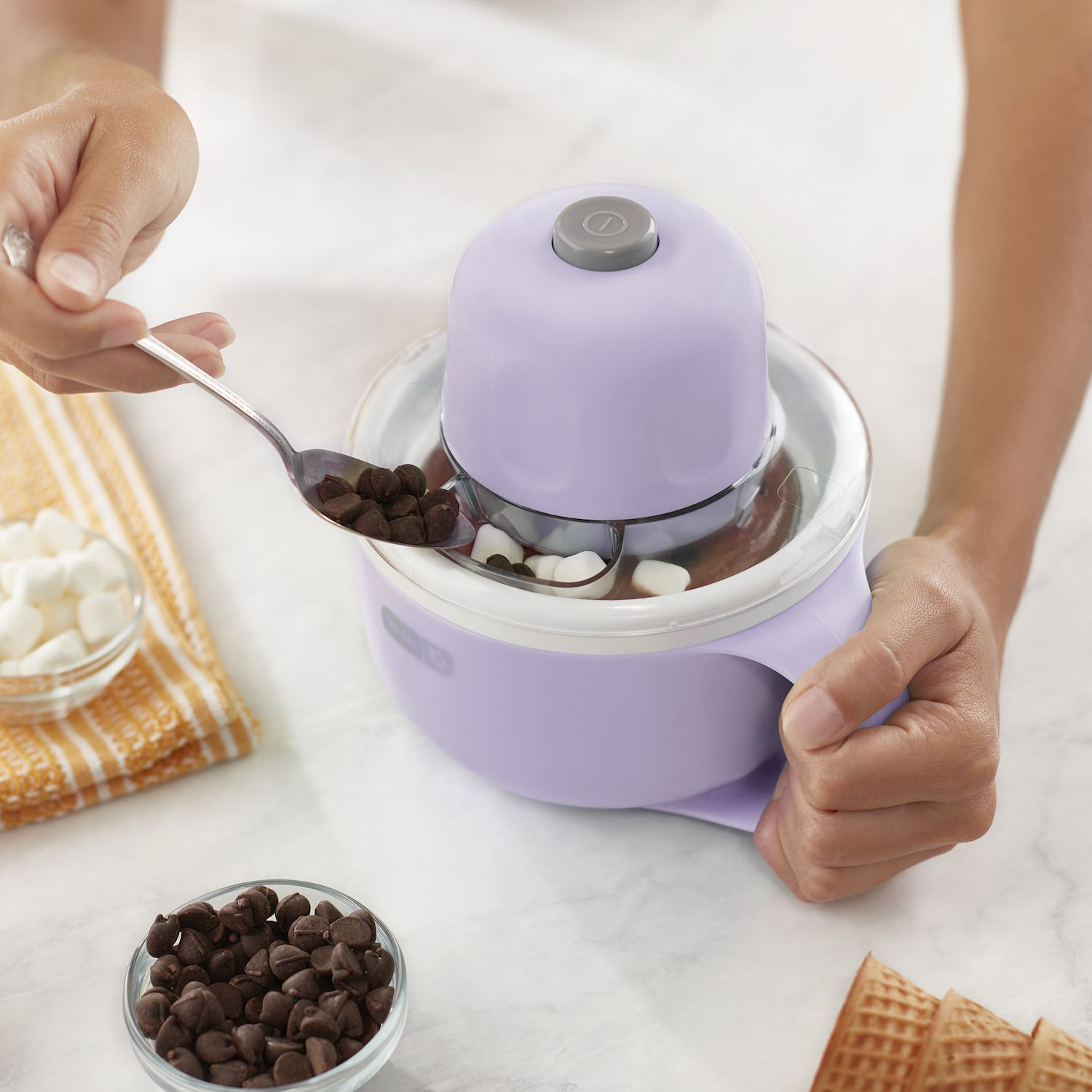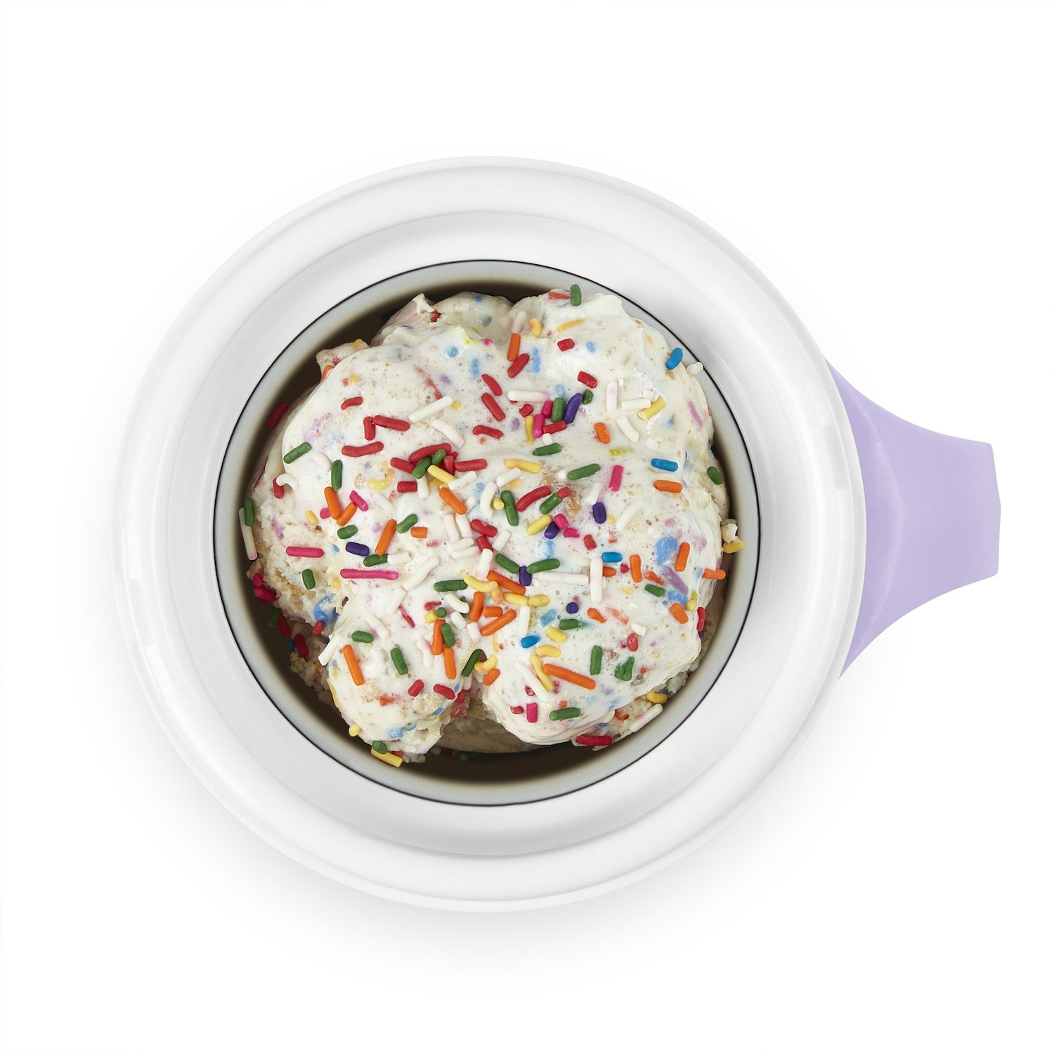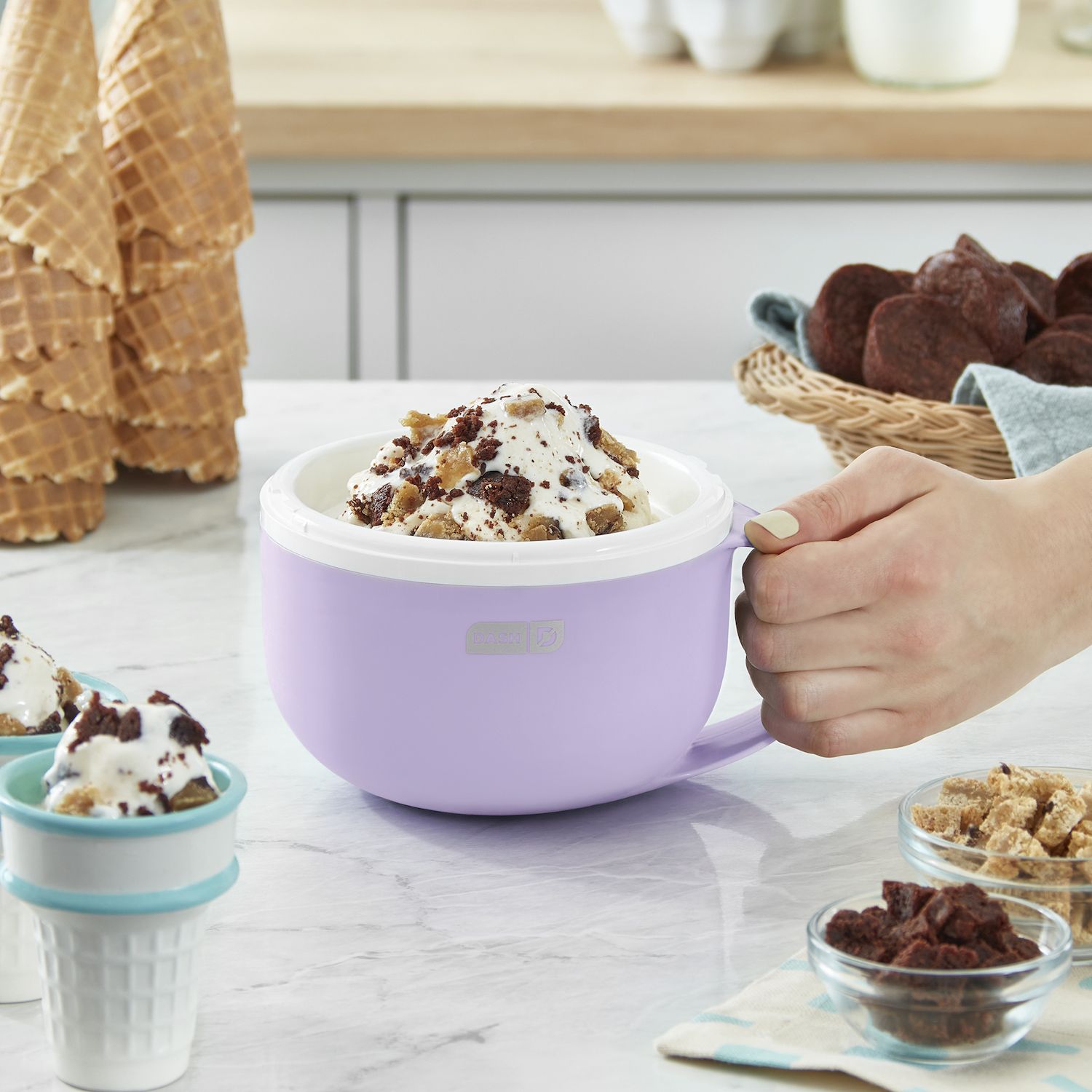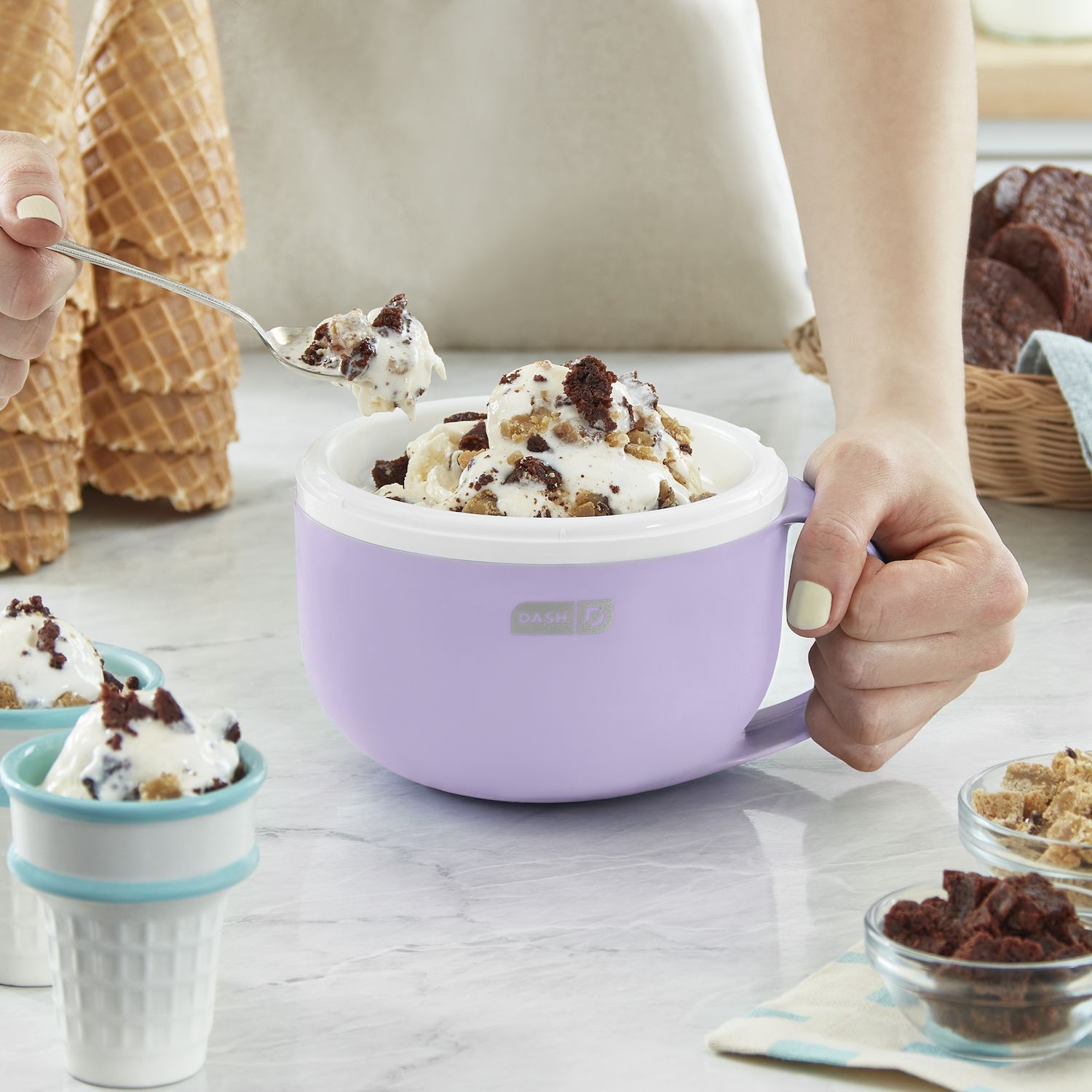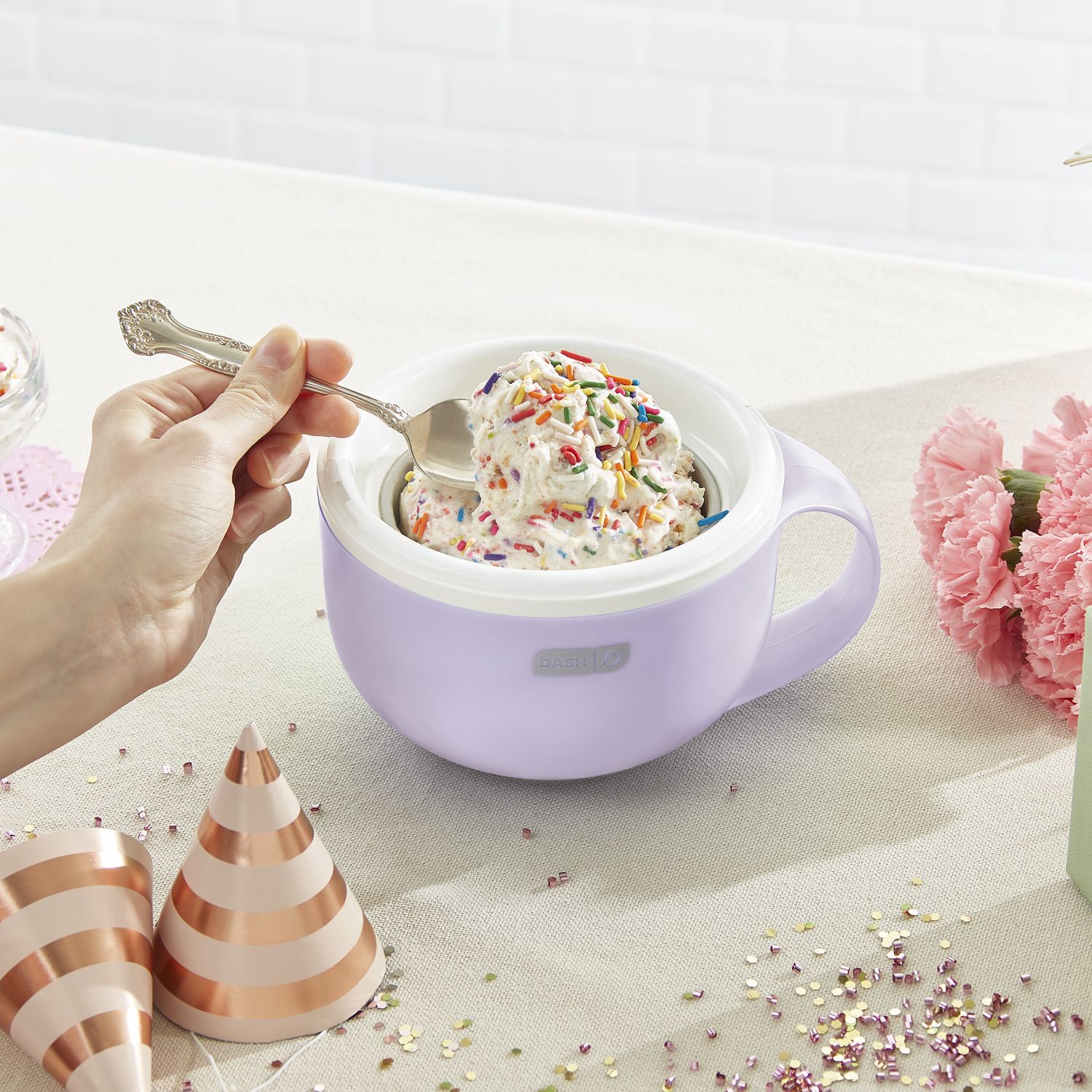 Make delicious single servings of ice cream, gelato, sorbet, and frozen yogurt with the Dash My Mug Ice Cream Maker! Its 1/2 pint capacity is great for making recipes you can personalize by mixing in your favorite add-ins using the built-in Ingredient Chute. Just freeze the base, add ingredients, and press the on button for a delectable snack in just 20 minutes! PRODUCT FEATURES Doubles as a freezable mug so you can eat your ice cream straight from the source. Easy one-touch power: simply freeze the Base, add your ingredients, and mix. No pre-made ice cream mix required! Built-in Ingredient Chute to add toppings as the ice cream churns. Detachable motor and cover for easy clean up. Compact SmartStore design fits all accessories in the mug for easy storage. WHAT'S INCLUDED Dash My Mug Ice Cream Maker, Recipe Guide & Instruction Manual. DETAILS 1/2 pint capacity 6.9"H x 5.9"W x 7.2"D 12.5 watts 26-in. Cord length Model no. DMIC100GBAQ04