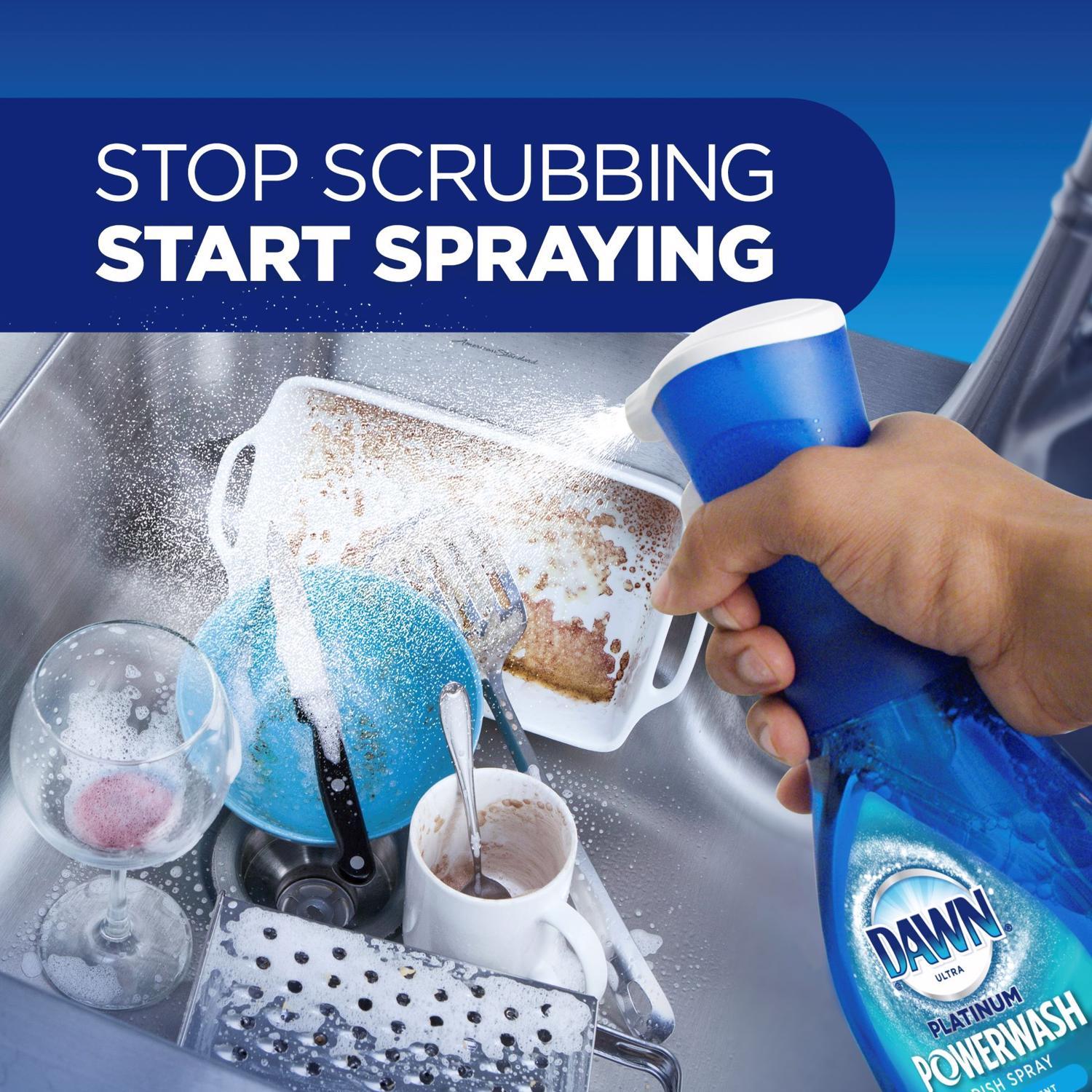 Dawn Platinum Powerwash Dish Spray, Dish Soap is the faster, easier way to clean as you go. The spray activated suds cut through grease on contact, without water for 5X Faster Grease Cleaning (vs Dawn Non-Concentrated). Dawn Powerwash is great for all your dishes with its unique spray technology even your hard to reach items, like blenders and baby bottles, are easy to clean.