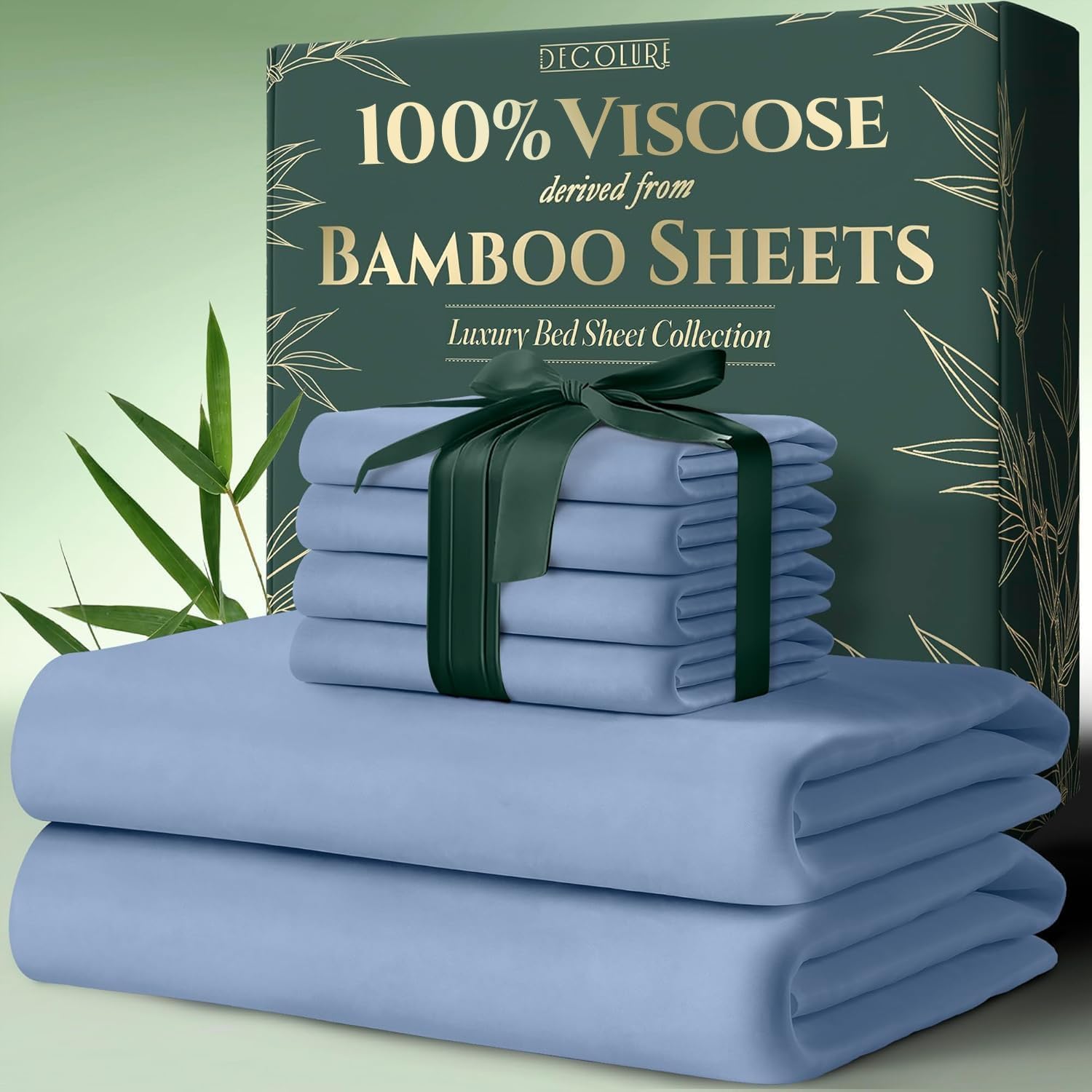 DECOLURE 100% Viscose Derived from Bamboo Sheets Queen Size 6pcs - Ultra Soft & Luxuriously Cooling, 17" Deep Pocket, Double Stitching, Perfect for Hot Sleepers - Queen Bed Sheets (Light Blue)