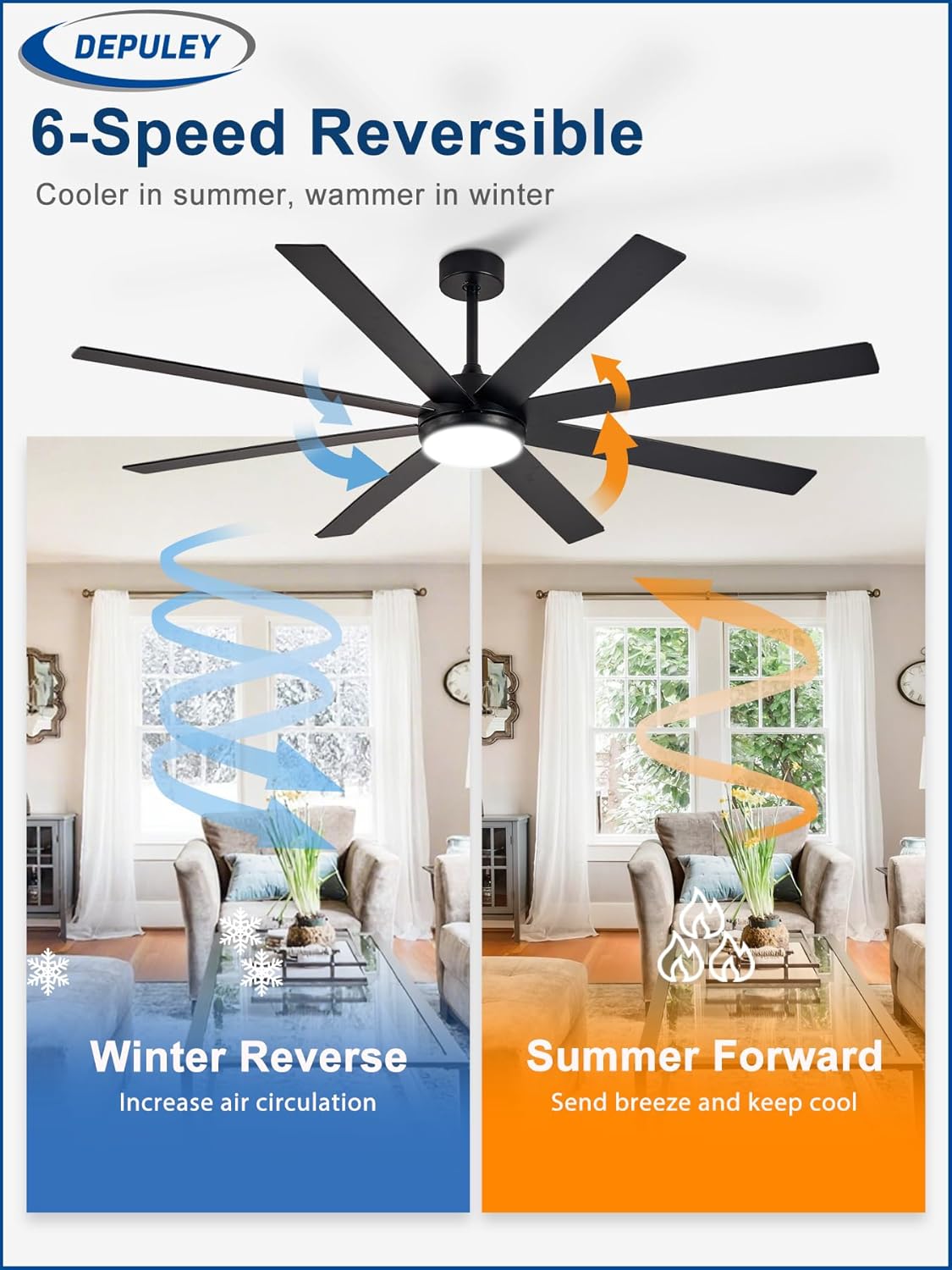 【Quiet Reversible DC Motor】Features an ultra-quiet, energy-efficient DC motor with reversible airflow—downdraft for summer cooling and updraft for winter warmth—enhancing year-round comfort without noise disruption.