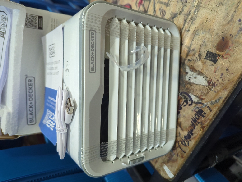 There's no need to break a sweat at the office with BLACK plus DECKER's mini cooler and USB desktop fan. With portable dimensions of 7.5 in. x 6.25 in. x 5.9 in. and weighing just 1.79 lbs., this compact cooler takes up limited space on countertops and desktops to work alongside your laptops and computers. With 3 fan speeds (Low, Medium, High) from 71.51 to 93.51 CFM, you can stay comfortable and breezy any time of day. Easily top fill the 0.5L water tank with water and watch it run up to 8-hours before it needs a refill. A removable cooling pad is included to help enhance the cooling of your air output. Simply pre-soak the pad under cold water and reinsert for best results. Our portable air cooler has an adjustable air vent to direct airflow where it's needed. Complete with non-skid grips on the bottom so you can secure your mini air humidifier cooler in place. The water tank features a water level indicator with LED feature. Light button lets you choose between solid or rotating color modes (red, purple, green, lavender, yellow, blue and rotating colors). This USB fan offers 0.06 l/h humidification output. Perfect for your office, home office, kitchen, bedroom, basement, or anywhere else you need to stay cool and comfy. Included with a 39 in. micro-USB charging cable.. Air Volume (CFM): 20. Amperage (amps): 0.8. Color Family: White. Color/Finish: White. Commercial / Residential: Residential. Cooling Area (Sq. Ft.): 100. Decibel (Sound) Rating: 40 dBA. Evaporative Cooler Features: No additional features. Evaporative Cooler Pad Material: Polyester. Evaporative Cooler Product Type: Portable Evaporative Cooler. Horsepower (hp): 1 hp. Included: No additional components or accessories are included. Indoor/Outdoor: Indoor. Material: Plastic. Number of Speed Settings: 3. Pack Size: 1. Product Weight (lb.): 1.8 lb. Returnable: 90-Day. Voltage (volts): 5. Water Tank Capacity (Gallons): 1. Wattage (watts): 2.4. Certifications and Listings: No Certifications or Listings. Cord Length (in.): 30 in. Product Depth (in.): 6.25 in. Product Height (in.): 5.9 in. Product Width (in.): 7.5 in. Cooling Area (Sq. Ft.): 100. Indoor/Outdoor: Indoor