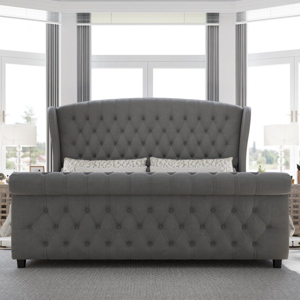 Dulane Chenille / Velvet Upholstered Sleigh Queen Bed with Scroll Wingback Headboard Grey