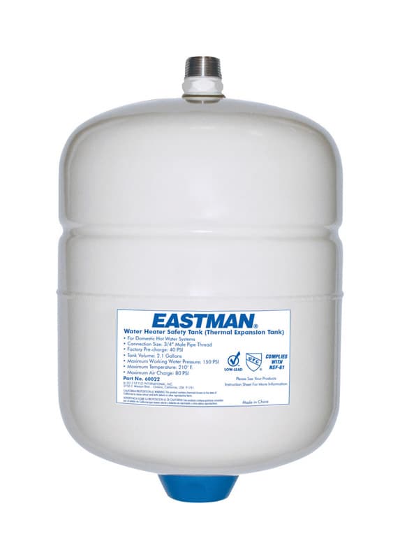 The Eastman 2-gallon thermal expansion tank is designed to prevent dangerous build-ups of pressure in your water heater tank. The thermal expansion tank stops hot water from backflowing into the cold water line while preventing hot water from escaping through the pressure relief valve and onto the floor. This constant fluctuations in water pressure can be dangerous and they can damage your water heater tank permanently, properly installing a thermal expansion tank can solve all these issues. Complies with NSF-61 and Lead Free law.