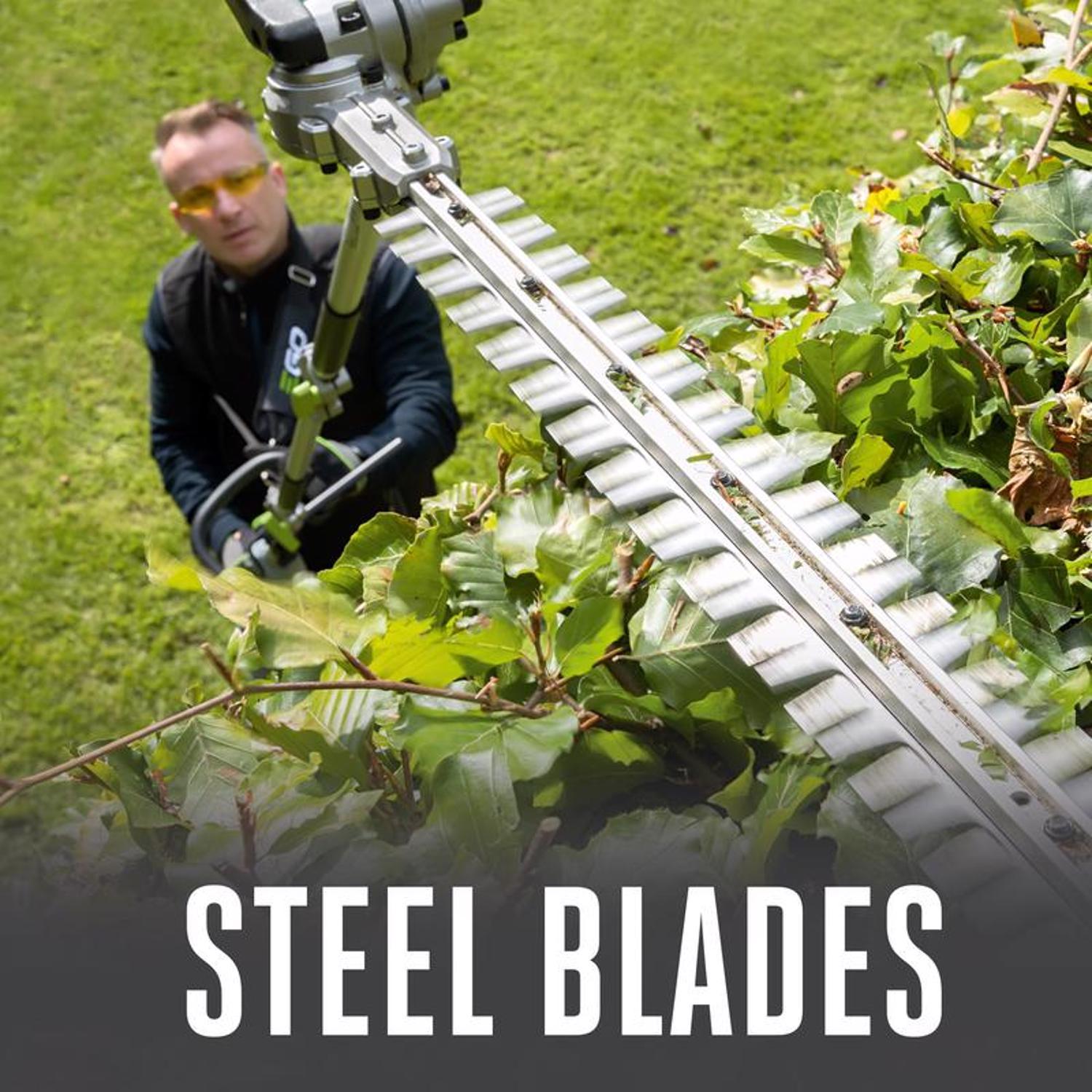 The EGO POWER 20" Hedge Trimmer Attachment is part of the EGO POWER Multi-Head System. This hedge trimmer attachment features dual action blades with a 1-inch cut capacity for convenient and efficient trimming. The 20-inch steel blades ensure durability and longevity, while 12-position articulation allows you to cut at any angle. EGO attachments are designed specifically for your EGO POWER Power Head (PH1400, PH1420) and offer the highest quality and performance.
