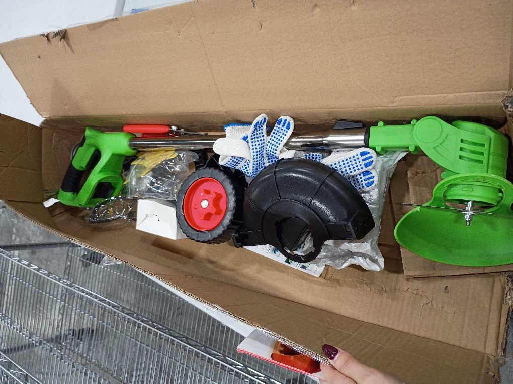 【Deluxe Accessories Pro】Includes: 1 x Electric weed wacker; 1 x pruning shears; 2 x 2000mAh Batteries; 1 x Charger; 1 x Saw Blades; 4 x Stainless Steel Blades; 10 x Plastic Blades; 1 x Wheel splash guard; 1 x Splash guard; 1 x Protective Work Gloves; 1 x Goggles; 1x User Manual.