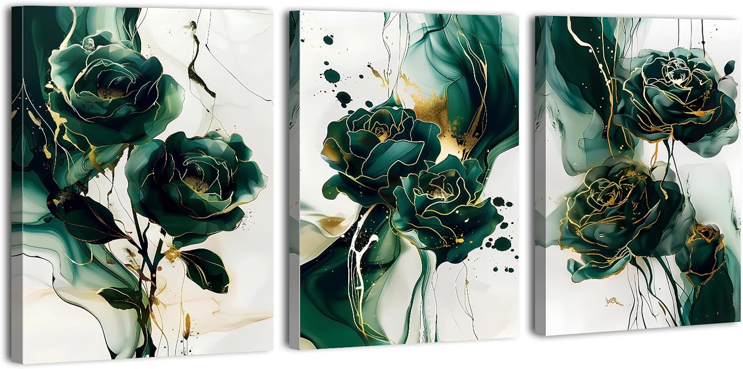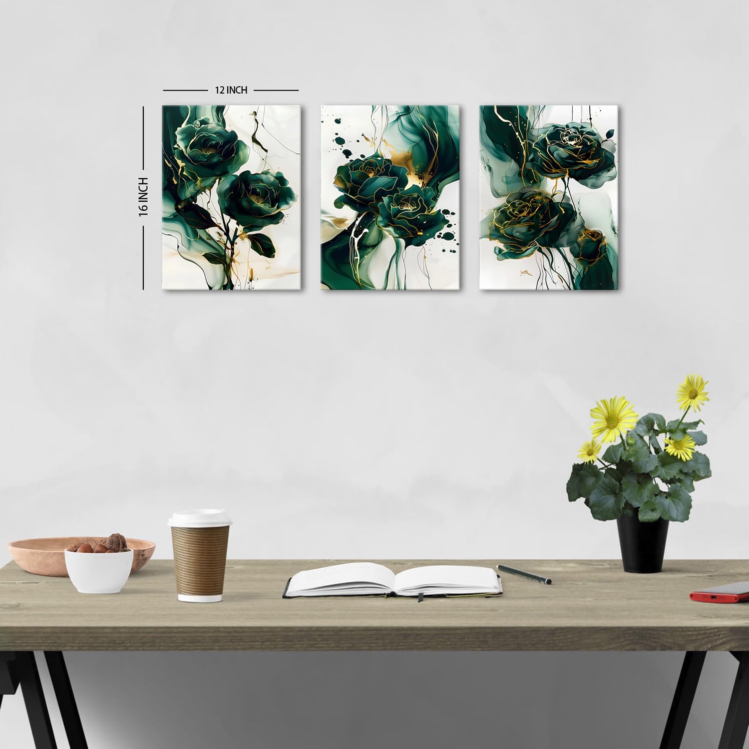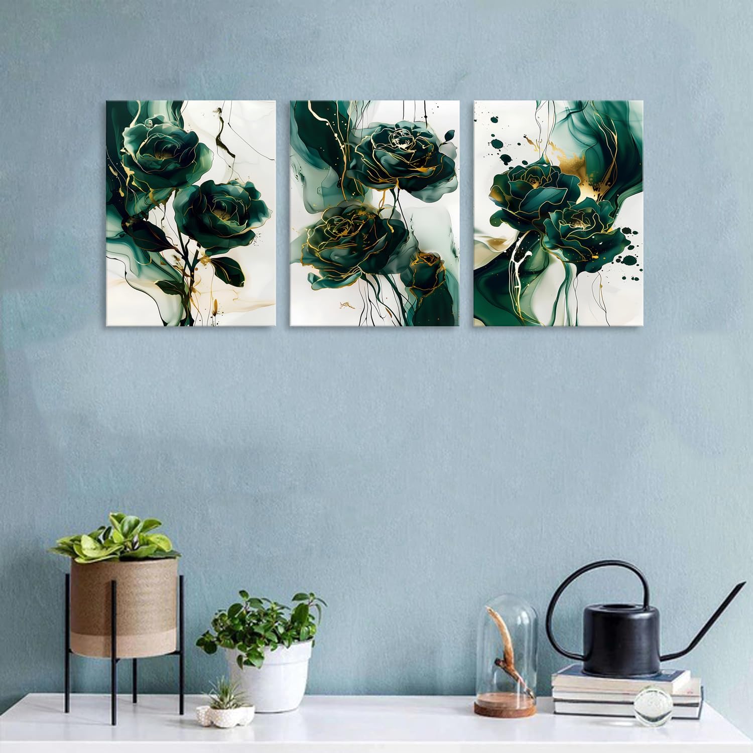 Emerald Green Wall Art for Living Room Green and Gold Marble Wall Decor Abstract Flower Wall Art Modern Botanical Canvas Prints Paintings for Bedroom Office Home Decorations 12x16" 3Pcs
