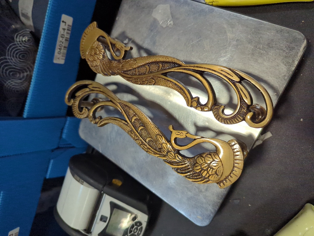 Package Contains: 2 Brass Designer Peacock Door Handles along with standard fixing screws