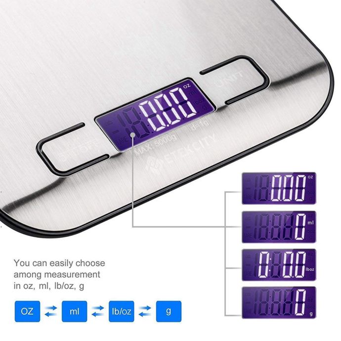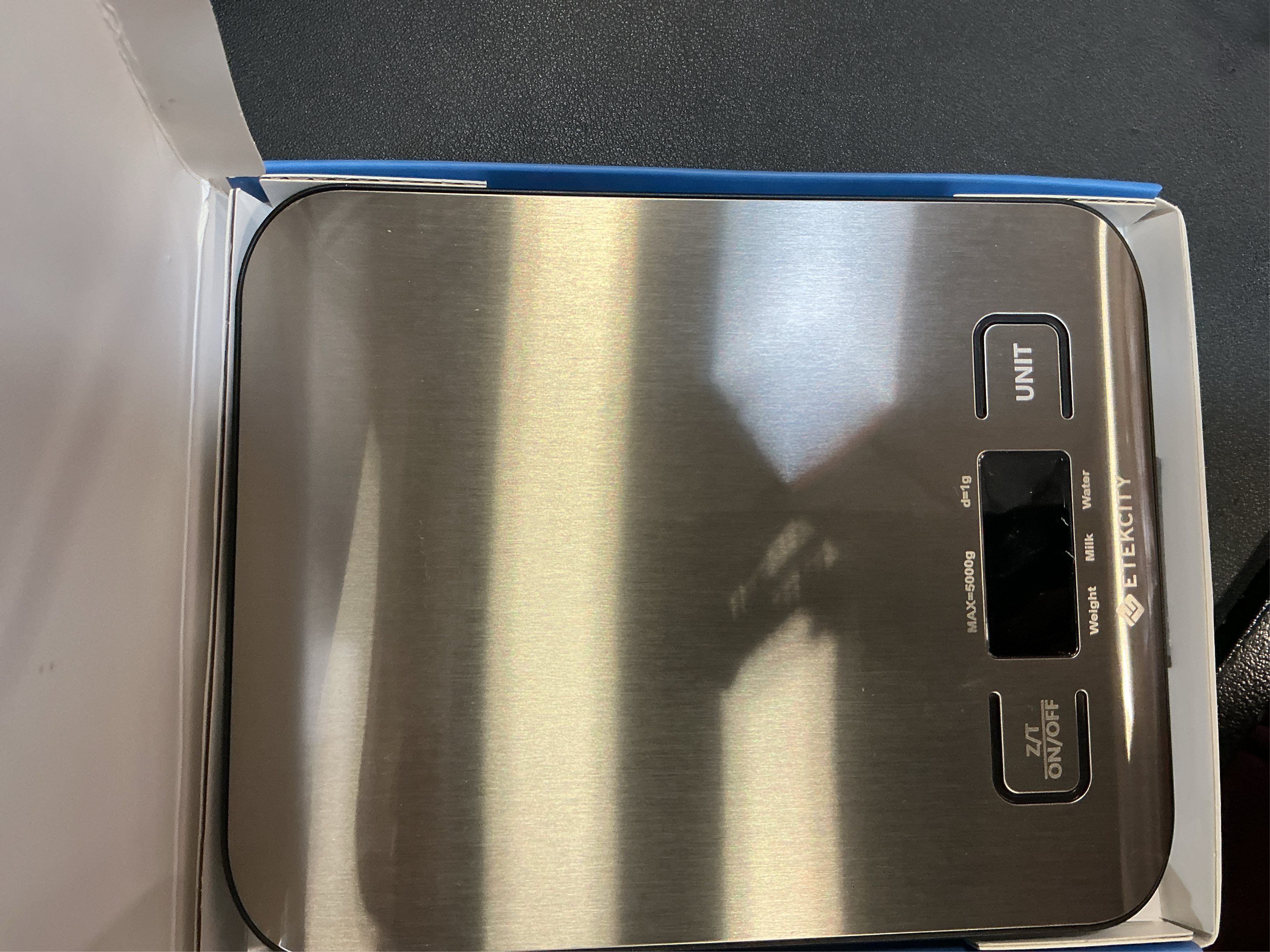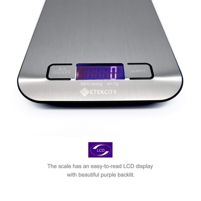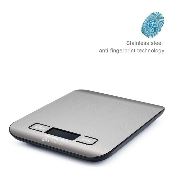 Weigh your ingredients and get precise readings with the Etekcity Digital Kitchen Food Scale. Ideal for weighing everything from veggies to meat, this food scale features a stainless steel surface with anti-fingerprint technology for a sleek look. Capacity: 176 ounce capacity. Units Measured: lb., oz., ml. Display Type: LCD display. Control Type: Push Button. Measurement Type: Imperial/Metric. Construction: Stainless steel. Hardlines Use and Care: Wipe clean. Made In: Imported. Battery Required Included: Batteries required, included. Battery use: 2 AAA battery incl.. Technical properties: