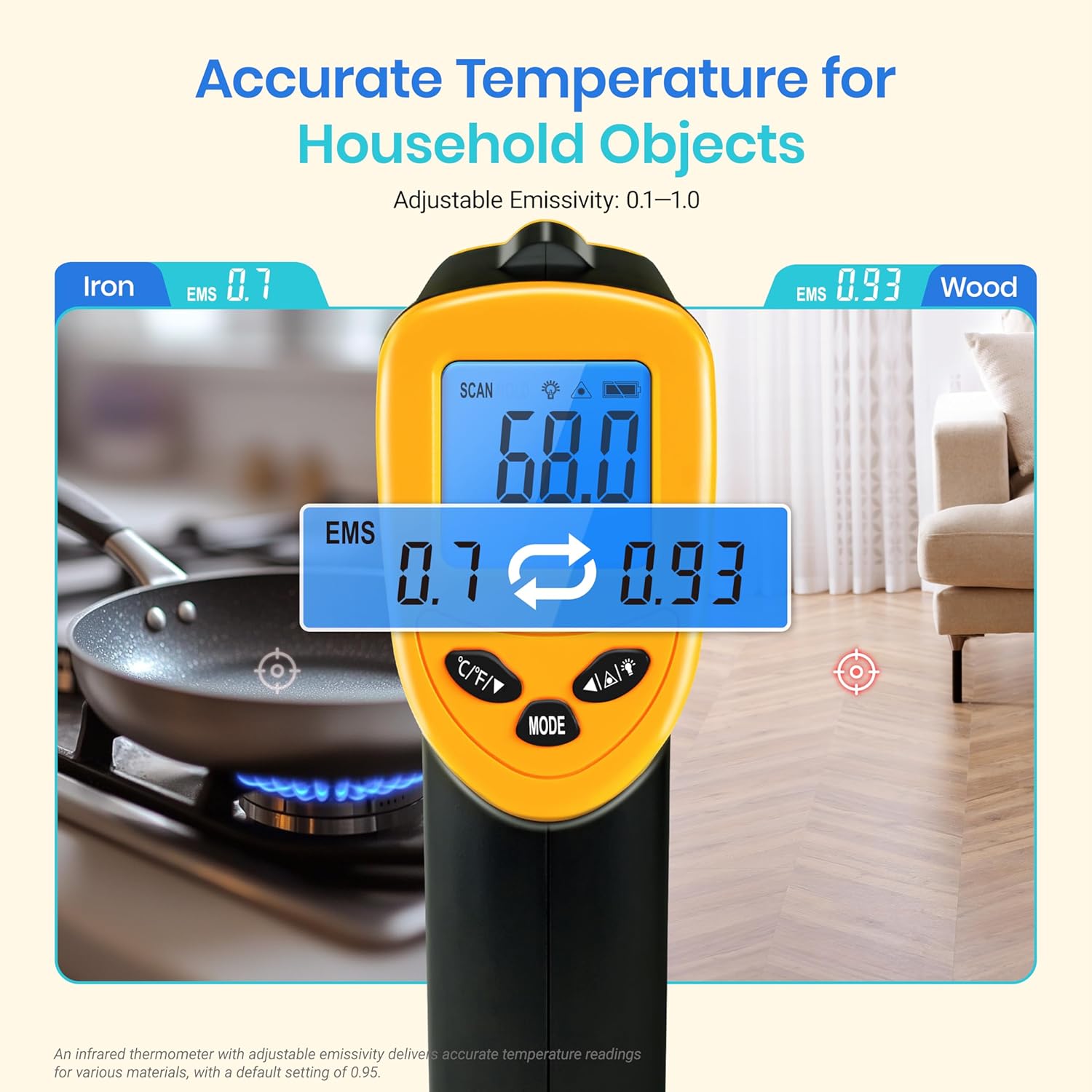 ???????????????? ???????? ????????????: Scan the surface of your object, hold down the trigger of the thermometer gun, get temp anywhere within the range of -58°–842°F / -50°–450°C. Then watch as your result appears on the bright LCD display in less than half a second.