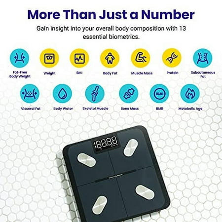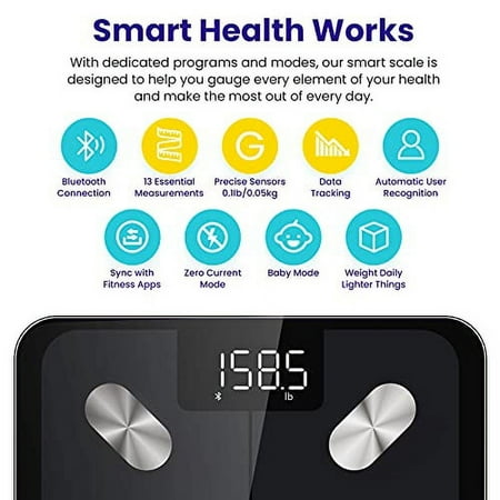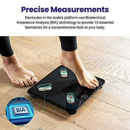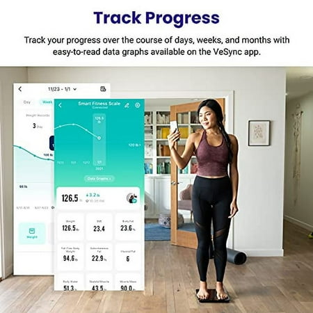 13 Essential Biometrics: Use the smart scale’s 13 essential biometrics to guide yourself toward healthy habits and gain detailed insights about the impact on body fat, muscle mass, BMI etc. High-Precision Measurements: BIA technology, 4 high-precision sensors, and auto-calibration give you accurate measurements down to 0.05lb / 0.02 kg (100g≤m≤10kg) and 0.1lb / 0.05 kg(10kg<m≤180kg) Helpful Data Graphs: Track your progress over days, weeks, and months by viewing data graphs on the free VeSync app to focus on fat loss and maximize your workout routine Sync Your Data: Connect with Apple Health, Google Fit, Fitbit, or Samsung Health to take your stats with you on the go Unlimited Users: Create unlimited profiles for friends and family, along with automatic user recognition to keep all your stats organized Personalize Your Goals: Set personalized weight and body fat goals and watch yourself progress over time and stay motivated For Lighter Items: Measure items as light as 100g, like packages or fruits, with total accuracy Baby Mode: Watch your little ones and pets grow over time by simply stepping on the scale while holding them in your arms Zero-Current Mode: Ideal for pregnant users, VeSync’s Zero-Current Mode turns off the electrodes for safe measuring