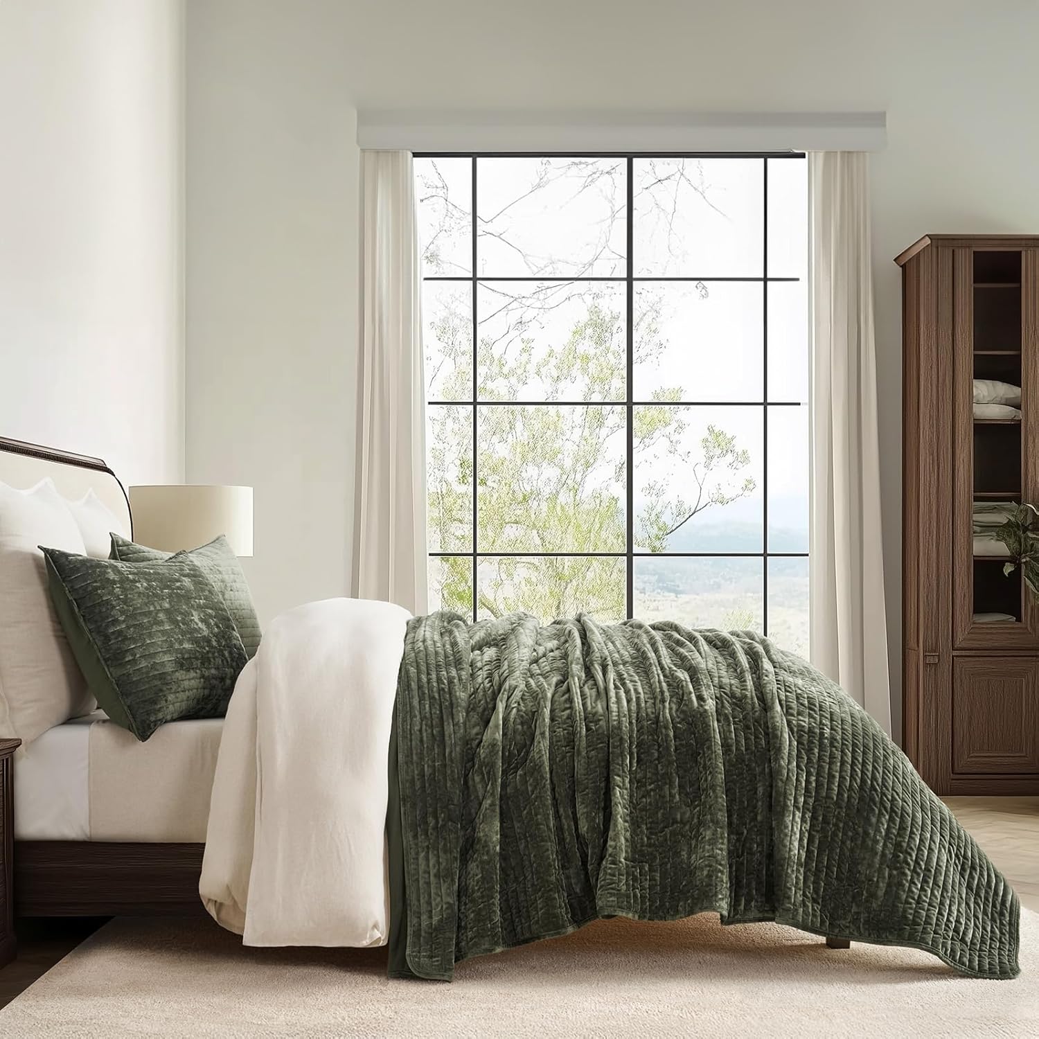 EVERGRACE Velvet Quilt Set Queen Size, Luxurious Soft Striped Channel Bedding Set, Lightweight Velvet Comforter for All Season, Quilted Bedspread Coverlet with 2 Matching Shams, Olive Green