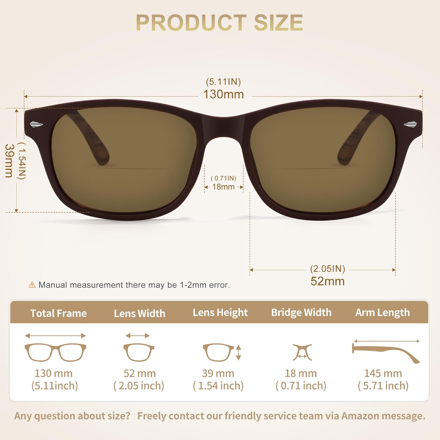 [Size Information]: Lens Width: 52 mm( 2.05 inches) | Lens Height: 39 mm( 1.54 inches) | Temple Length: 145 mm( 5.71 inches) | Nose Bridge: 18 mm( 0.71 inches) | Total Frame Length:130 mm (5.11inches).
