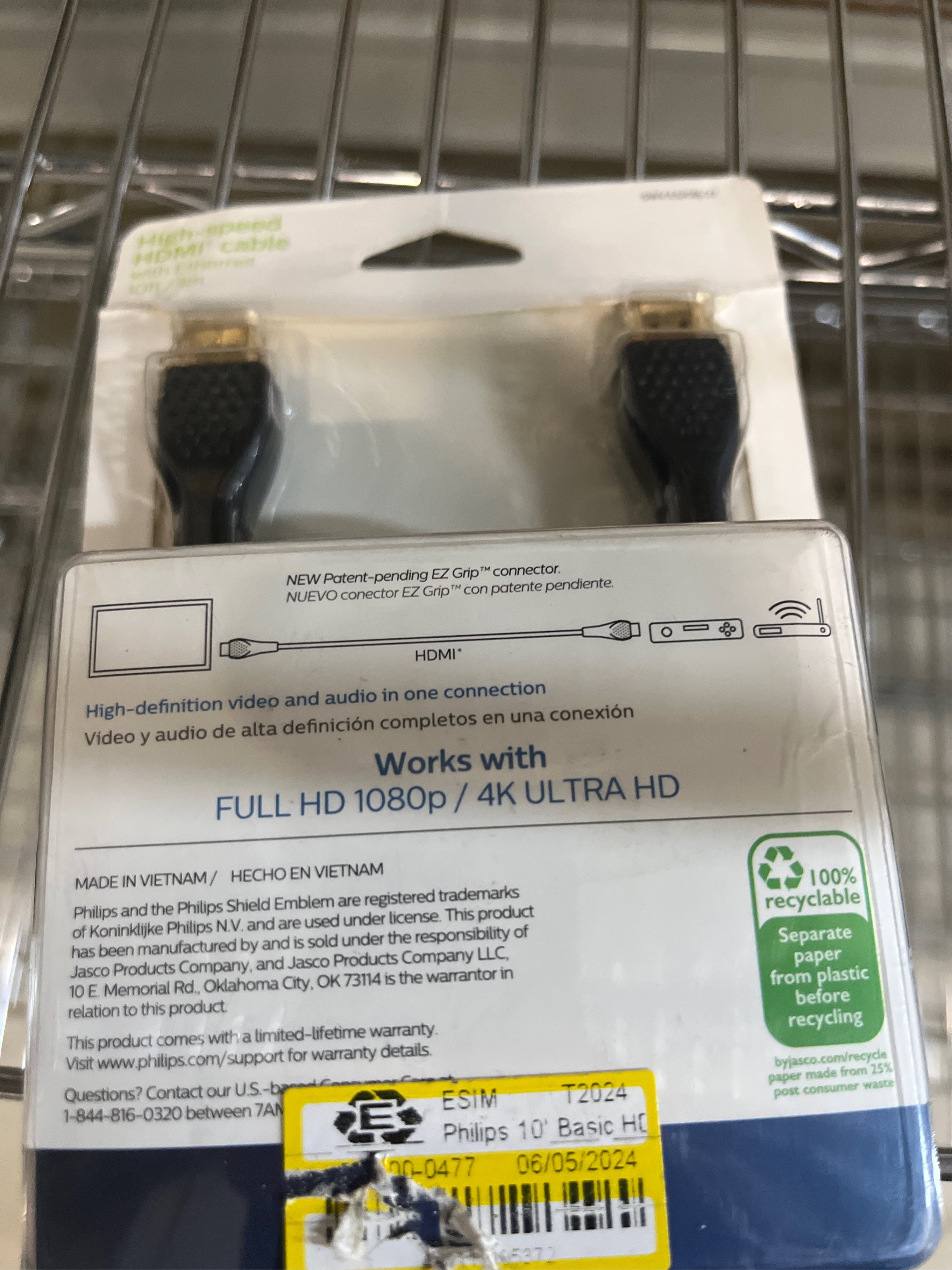 Take hold of superior performance with the Philips HDMI Cable with Ethernet. This high-quality cable features patent-pending EZ Grip connectors that let you easily grasp each end as you connect any 2 HDMI-equipped devices. The gold-plated connectors provide crystal-clear transfer of video and audio, allowing you to enjoy rich images in 1080p and 4K Ultra HD. Experience a smooth picture with a video refresh rate range of 60-600Hz as the HDMI cable seamlessly displays TV shows, sports, video games, movies and more from your HDTV. Additionally, maximum shielding minimizes electromagnetic interference, boosts data transfer up to 10.2 Gbps and provides lossless surround sound, allowing you to experience high-quality audio and video for the best in home entertainment. The cable's 10 ft. L is perfect for versatile gaming and home theater setups. Give your home entertainment system a boost with the Philips HDMI Cable with Ethernet. Universal compatibility-easily connect HDMI-enabled blu-ray and DVD players, streaming devices such as Roku, Apple TV and Amazon devices, gaming consoles like PlayStation and Xbox, computers and more to your TV or electronic display. Superior performance-supporting 3D, full HD 1080p and 4K ultra-HD, this high-quality HDMI cable with ethernet and gold-plated connectors features lossless surround sound, data transfer speeds up to 10.2 Gbps (plus bandwidth) and more to ensure you receive the most out of your high-definition equipment. EZ Grip-this black, 10 ft. HDMI cable features patent-pending EZ Grip connectors that let you easily grasp each end of the cable as you connect any 2 HDMI-equipped devices. Maximum shielding-the durable cover blocks Electromagnetic Interference (EMI) to ensure a clear transmission and superior picture quality. Product Length (ft.): 4.8 ft. Features: Shielded
