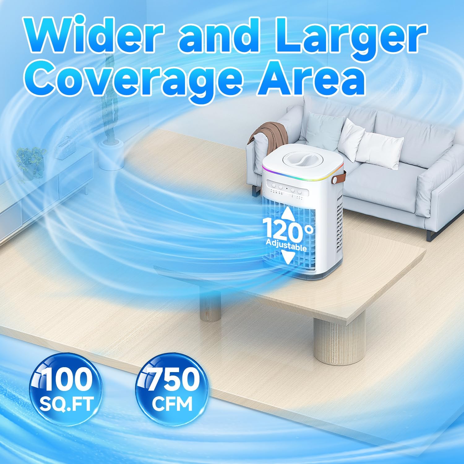 【120° Wider Outlet Covers Max 100 SQ.FT】This portable ac units for rooms adopts a 120° vertical adjustable air outlet design, allowing you to flexibly control the airflow direction. The powerful 750 CFM air volume it generates ensures even air distribution and effectively cools spaces up to 100 square feet, making portable evaporative coolers ideal for bedrooms, study rooms,kitchen or offices.