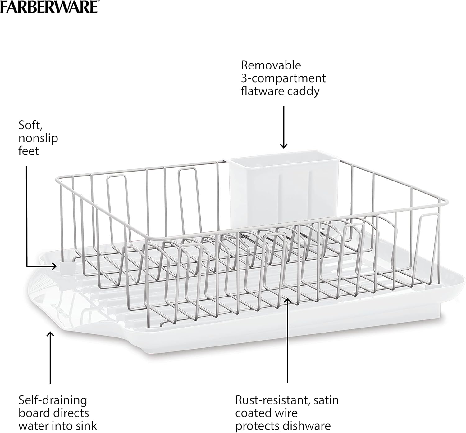 Farberware Classic Large Rust Resistant Full Dishrack with Removable 3 Compartment Flatware Caddy, Andlged Drain Board, 3-Piece, Grey