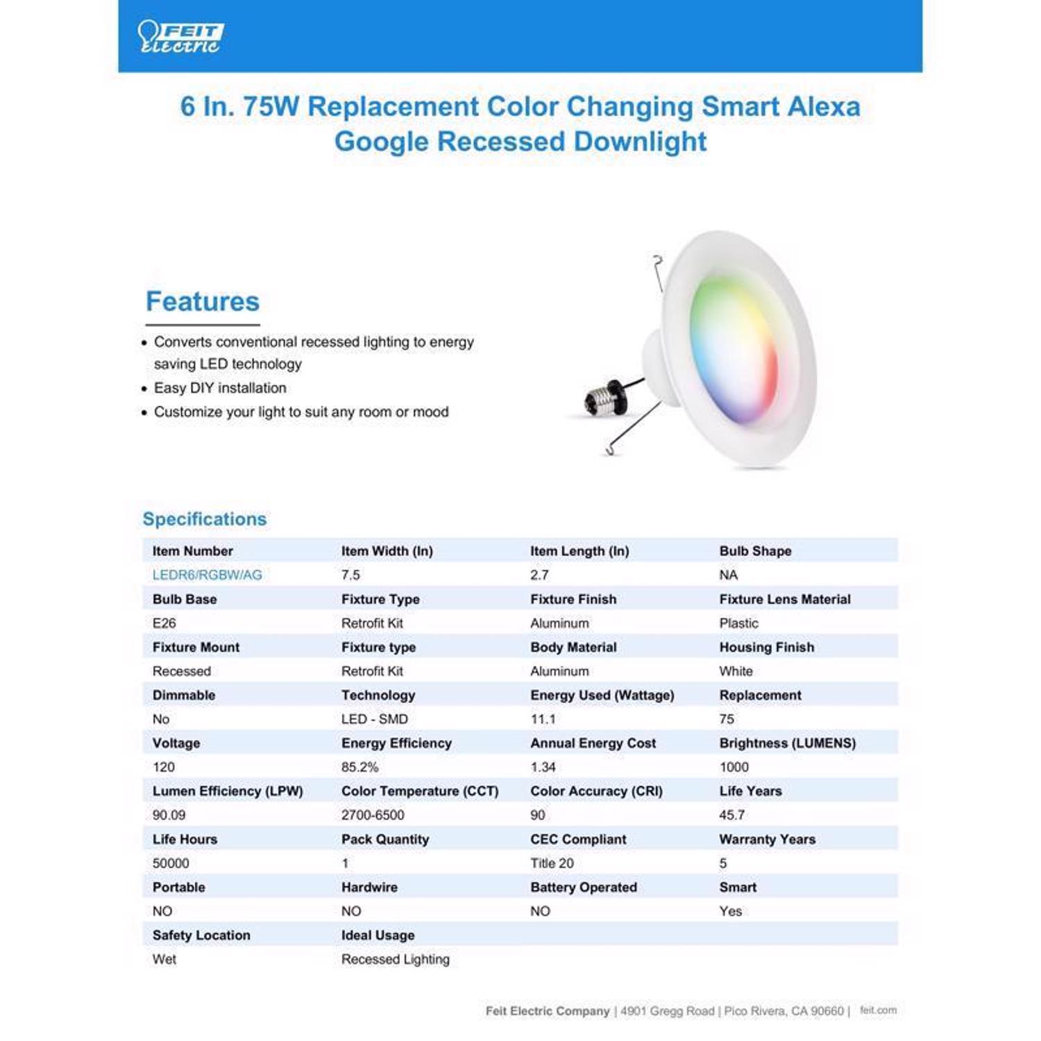 Fitting most 5-6 inch recessed can housings, the LEDR6/RGBW/AG color-changing smart recessed downlight produces 925 lumens using only 12.3 watts. These smart lights connect directly to your WiFi at home, allowing control over color, dimming, schedules and more with an intuitive mobile app or your Google / Alexa device.