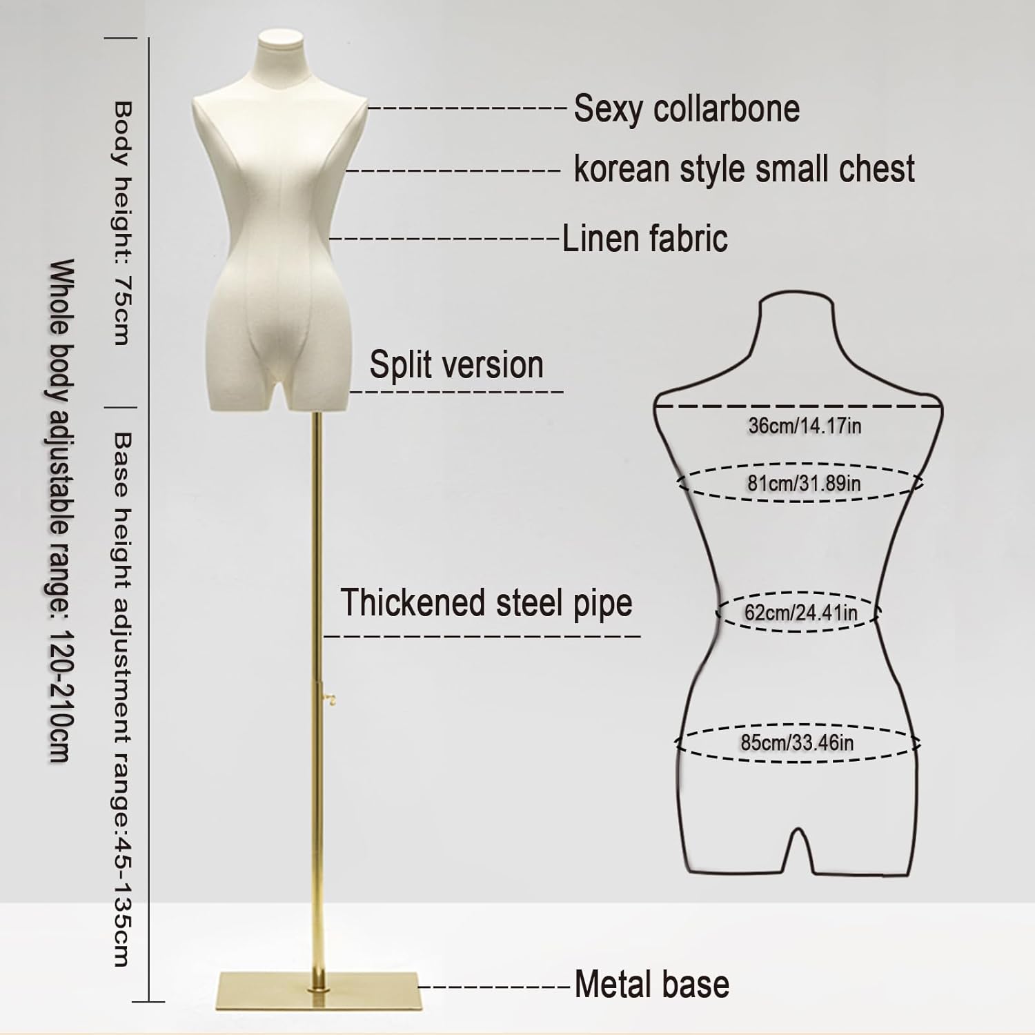 FEMALE MANNEQUIN DRESS FORM: Upper body is FRP torso with linen cover, filled with a small amount of PP cotton in the middle to avoid damage to clothes, can be moved anywhere, shoulder width x bust girth x waist girth x hip girth: 36 x 81 x 62 x 85 cm (14 x 32 x 24 x 34 inches)