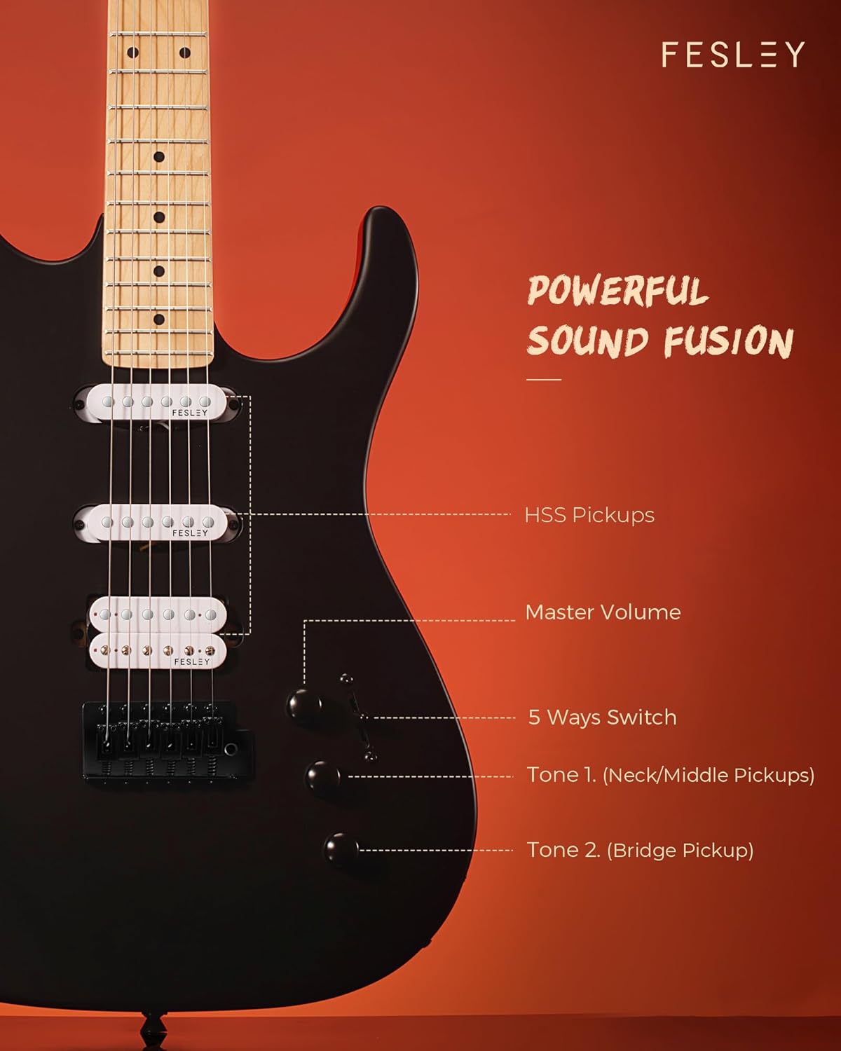 H-S-S PICKUPS: The Fesley ST-style electric guitar features two classic single-coil pickups and one humbucker pickup. With a 5-way pickup switch, 1 volume control, and 2 tone controls, it not only delivers bright tones but also produces thick mid or low frequencies, offering saturated and warm sounds. Perfect for playing songs with distortion characteristics, such as rock and metal.