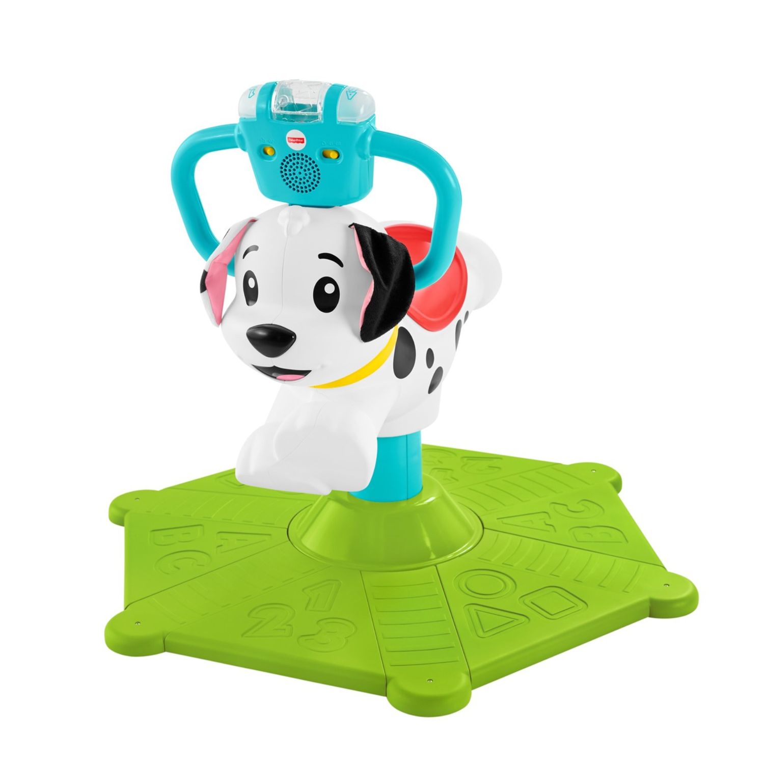 Baby can bounce and spin along to fun learning songs with this stationary ride-on puppy toy. PRODUCT FEATURES Puppy plays music and educational content as baby bounces or spins 360 degrees Light-up rattle roller, ABC and 123 buttons activate more songs and sounds 2 ways to play: Learning and Music modes Easy-grip handles, sturdy base, and comfy saddle helps baby feel secure as they play For kids ages 12 months and older, max. Weight 55 lb (25 kg) PRODUCT DETAILS Plastic Wipe clean, spot clean Imported Fits 1 rider 3 AA alkaline batteries required, not included Assembly required Age: 1 year & up
